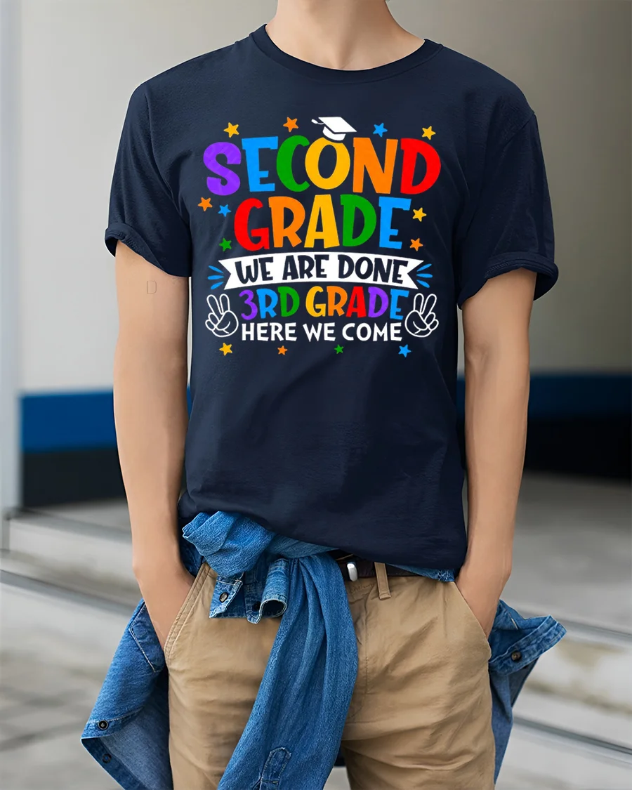 2nd Grade Done 3rd Grade Here We Come T-Shirt - model wearing navy shirt, hands in pockets