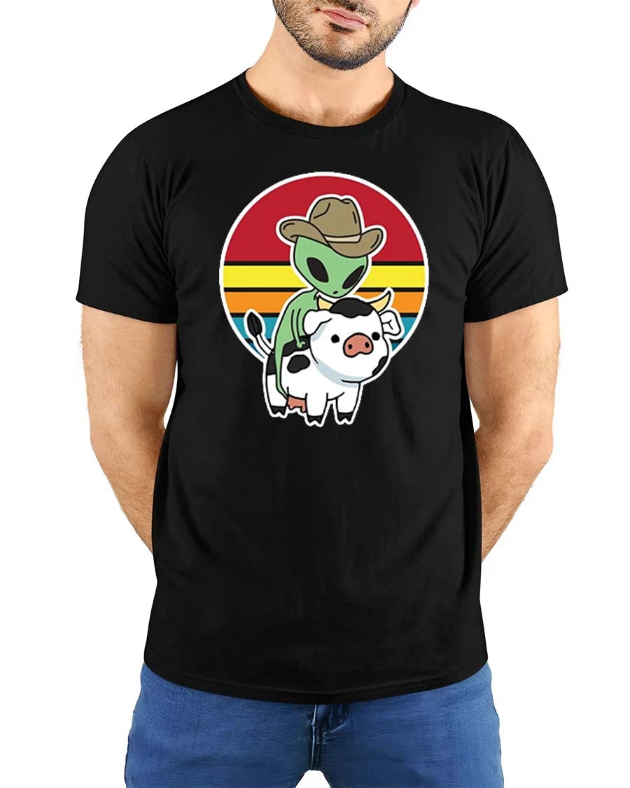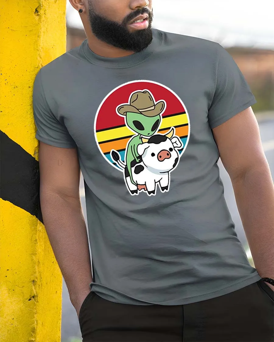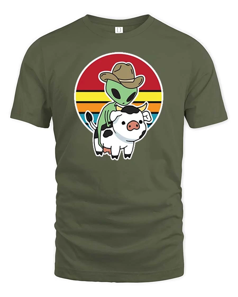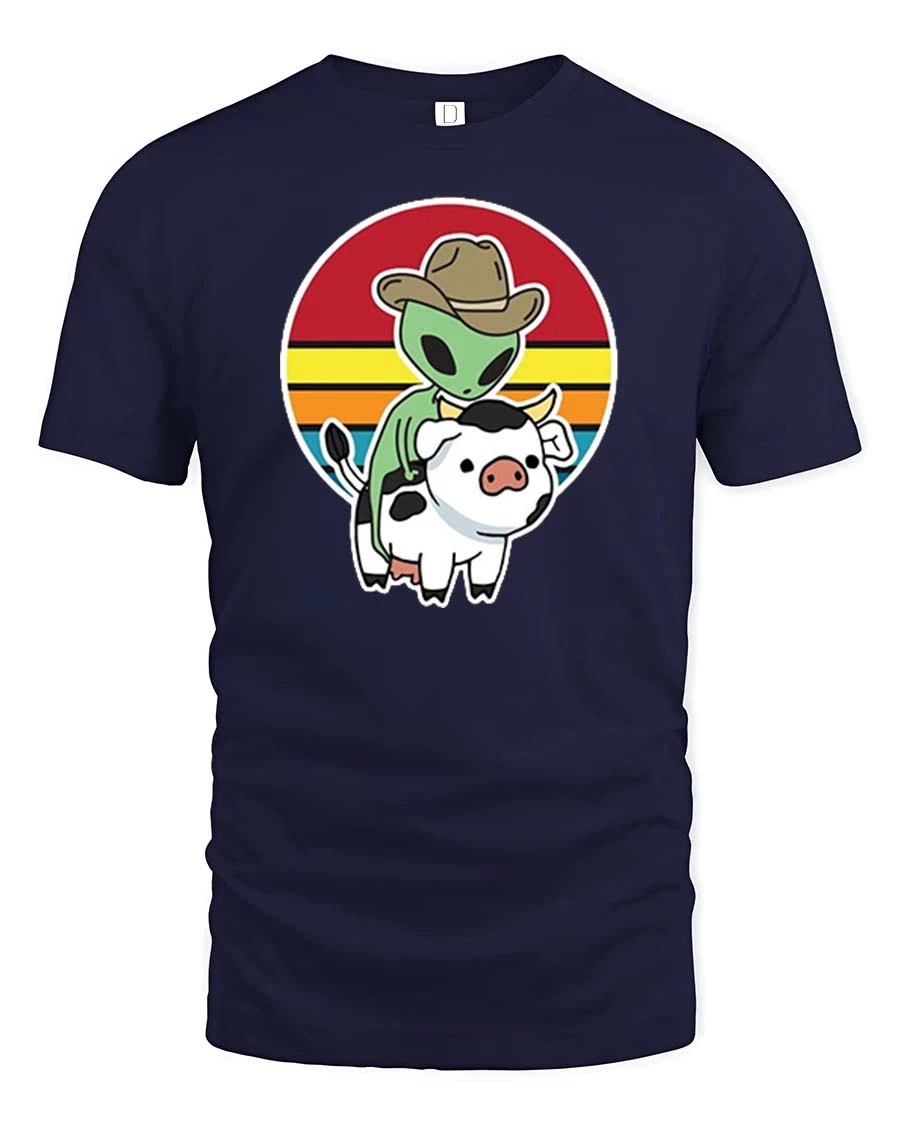 Alien Cowboy Riding Cow Funny Retro Sunset Graphic T-Shirt blends fun comfort and originality effortlessly.