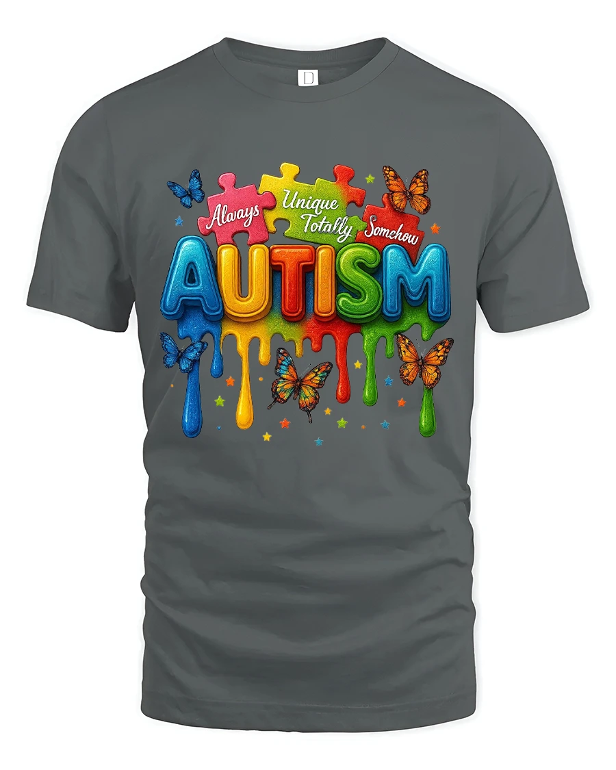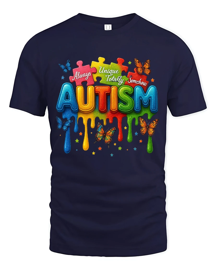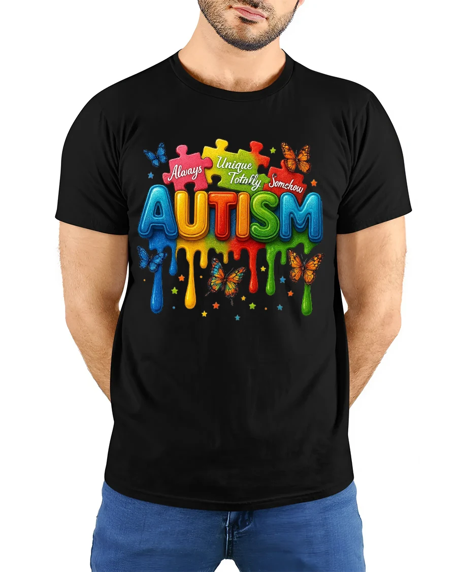 The Always Unique Totally Awesome Autism Colorful Graphic T Shirt celebrates individuality creativity and acceptance through a bold and expressive design.