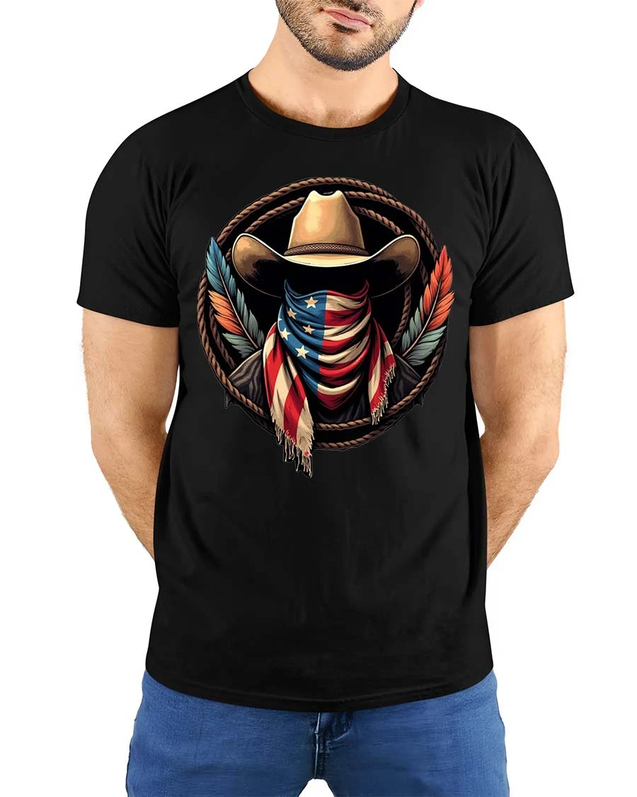 American Cowboy Flag T-Shirt Patriotic Western Graphic blends rugged western style with bold American pride.