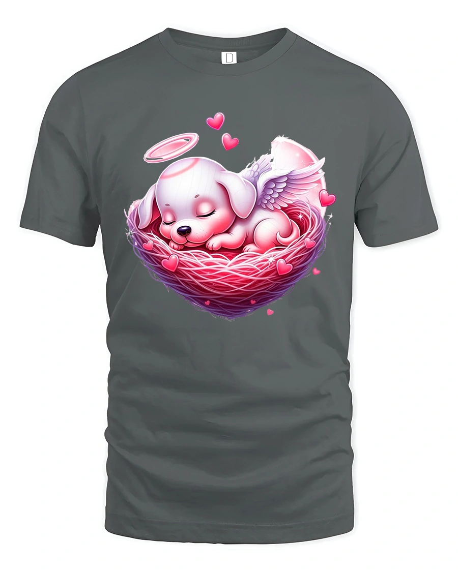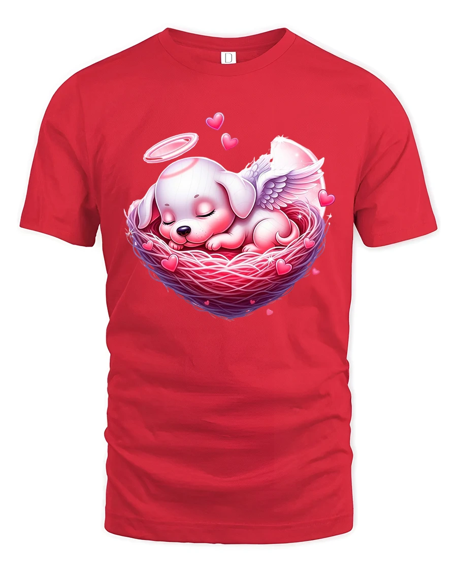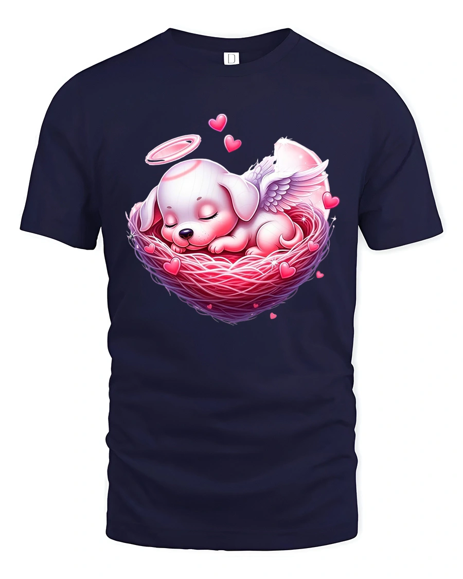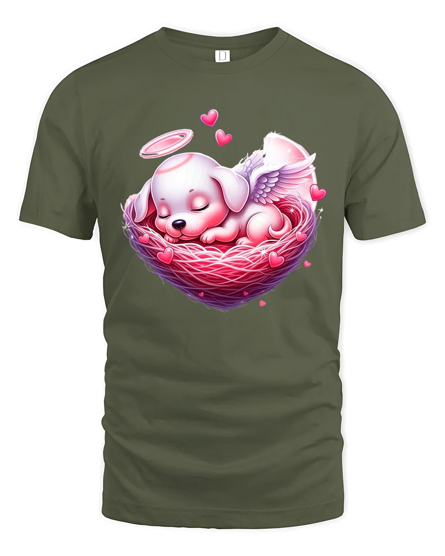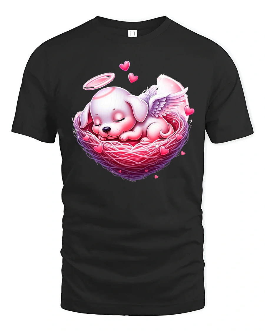 Wrap yourself in sweetness with the Angel Puppy Sleeping In Heart Nest T Shirt. This heartwarming design features a peaceful little puppy with tiny wings and a soft halo resting inside a glowing pink heart nest. The angel puppy t shirt captures innocence, love, and gentle charm in a beautifully detailed illustration that instantly melts hearts.