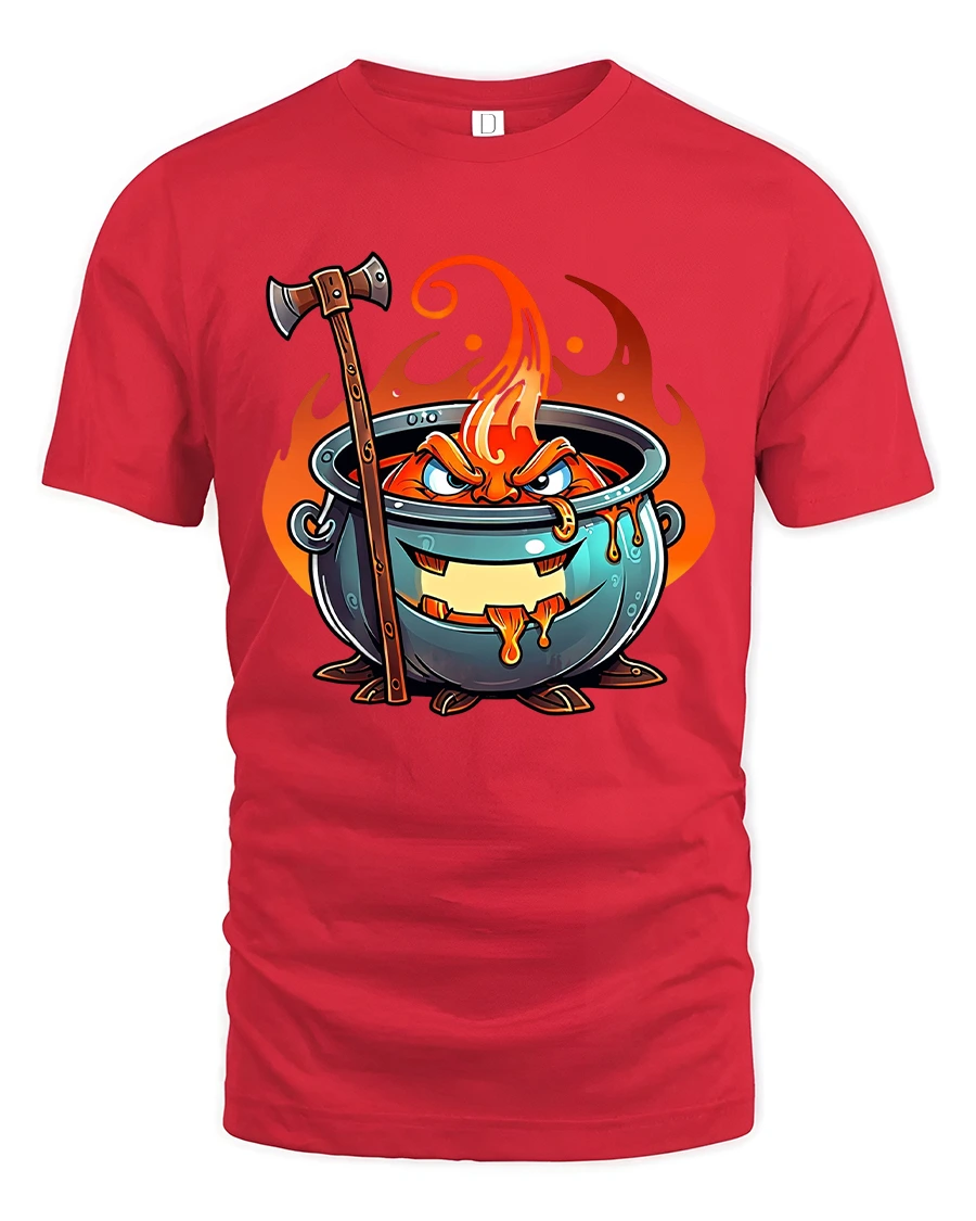 Angry Fire Cauldron Cartoon Fantasy Graphic Tee Tshirt - red t-shirt on white background