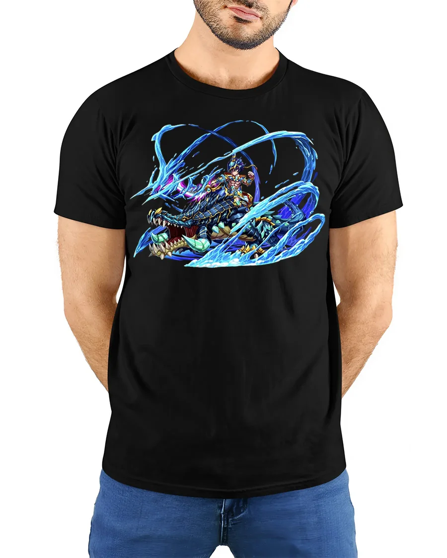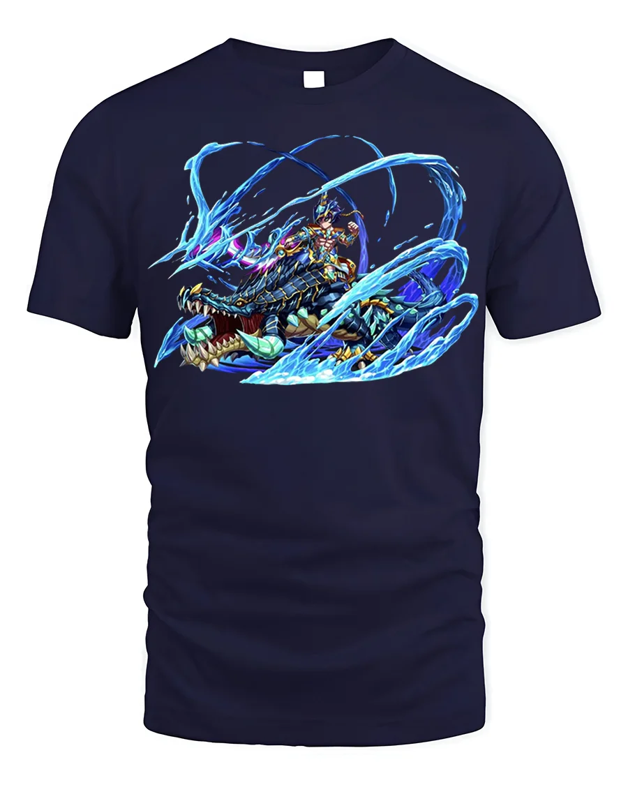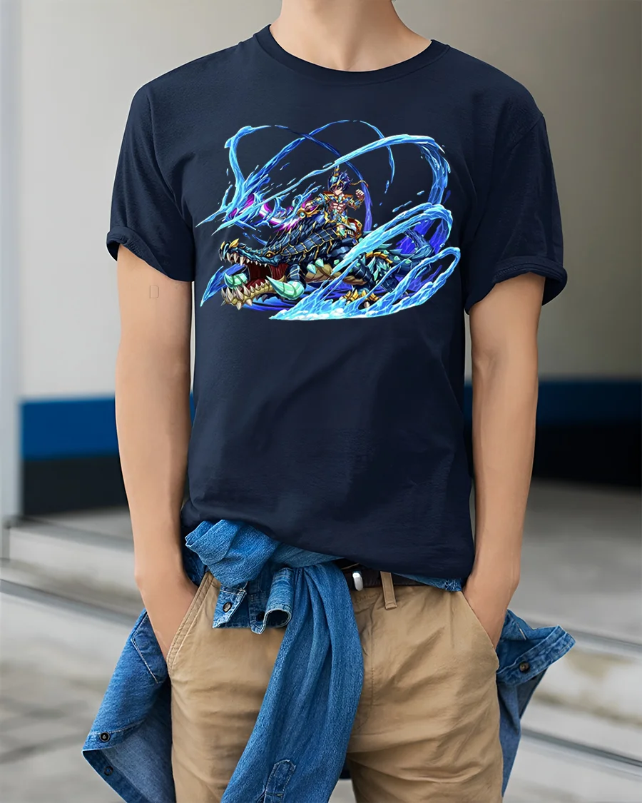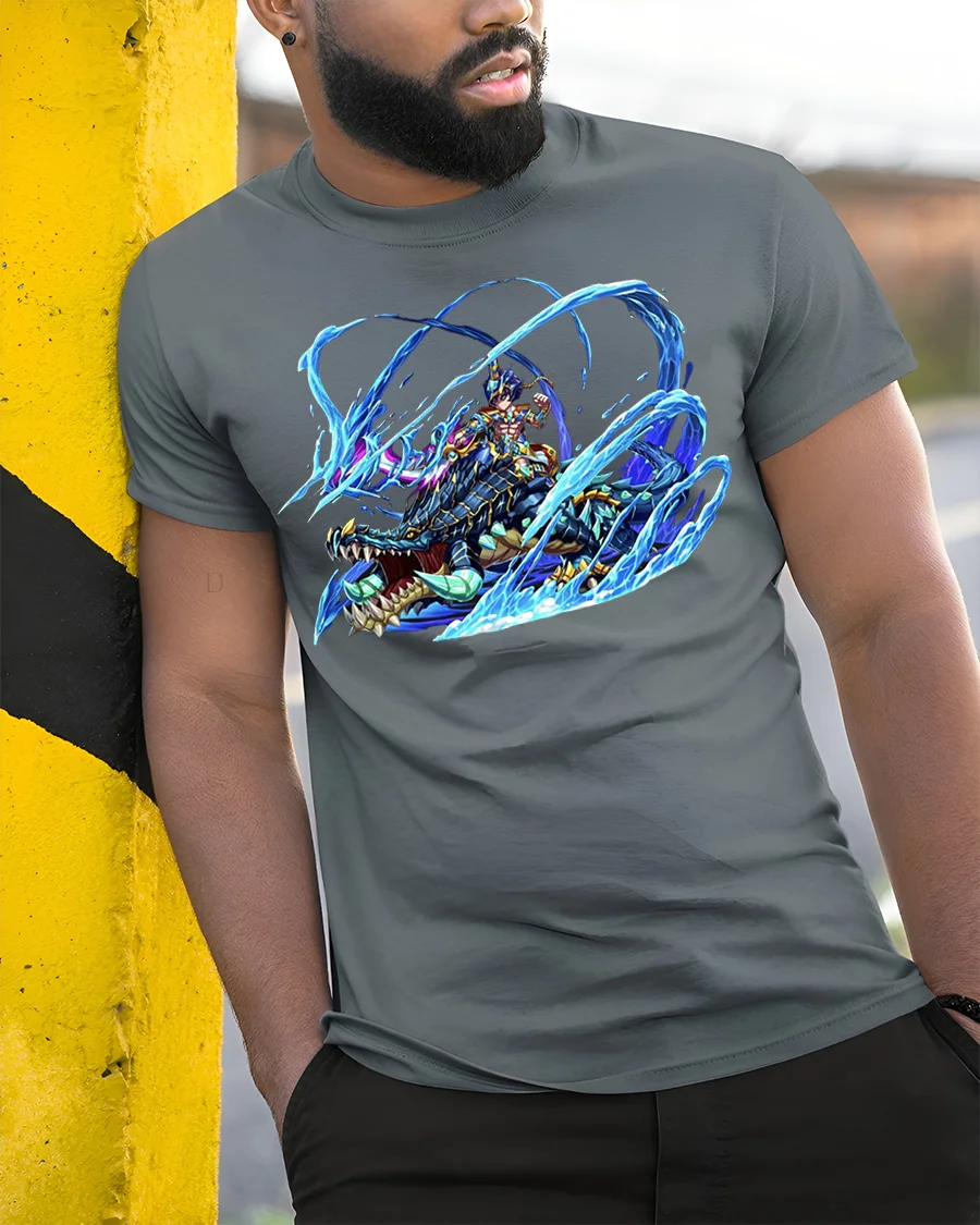 Dive into adventure with our Aqua Dragon Rider T-Shirt. This thrilling tee features a valiant warrior riding atop a formidable water dragon, both surrounded by dynamic splashes and currents of blue energy. The vibrant colors and action-packed scene bring this fantasy beast tee to life, making it a captivating piece for any fantasy enthusiast.