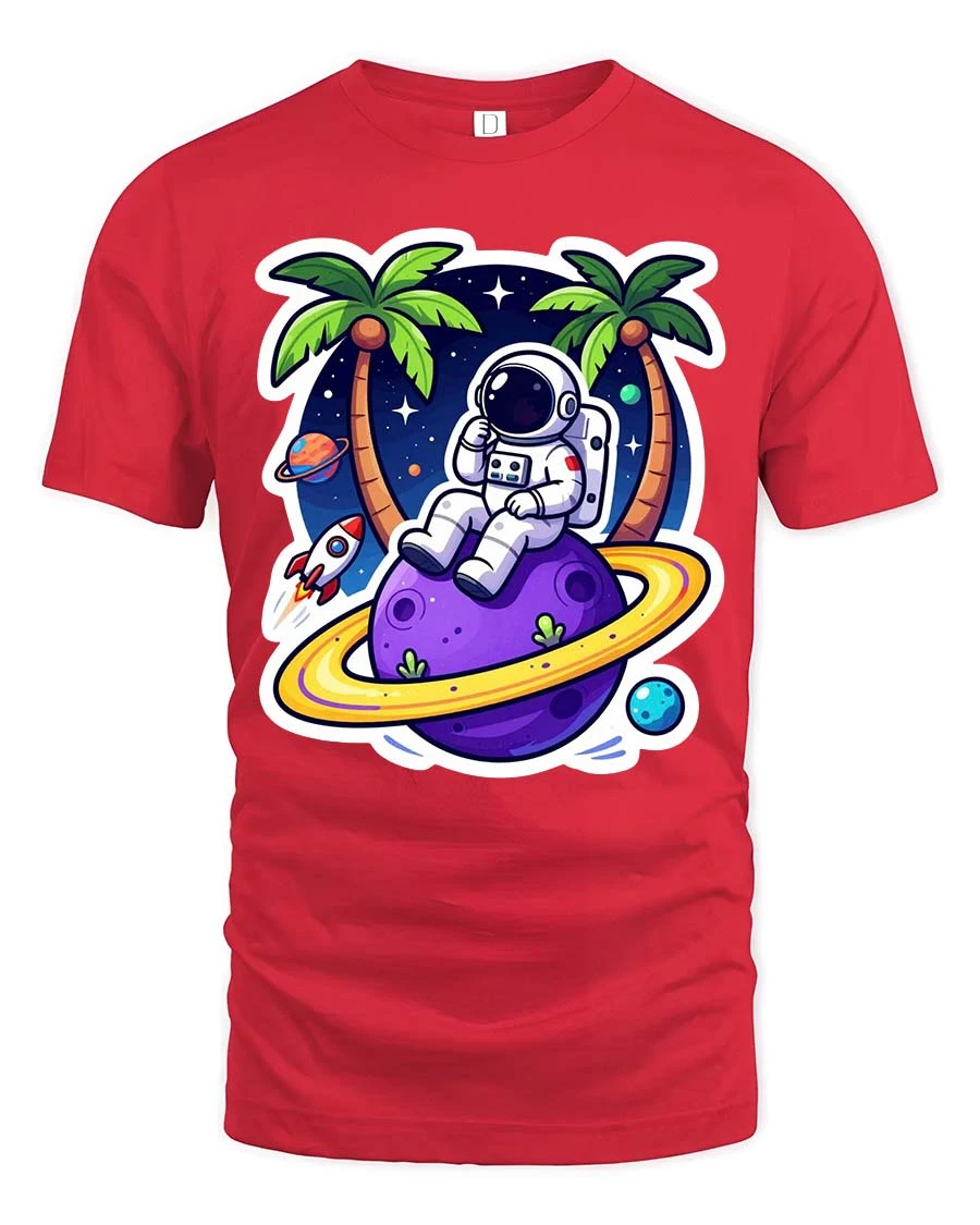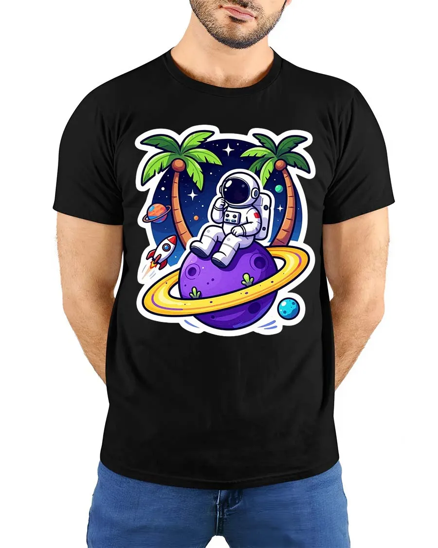 This astronaut beach t-shirt features a fun and imaginative design of an astronaut relaxing on a colorful planet surrounded by palm trees and stars.