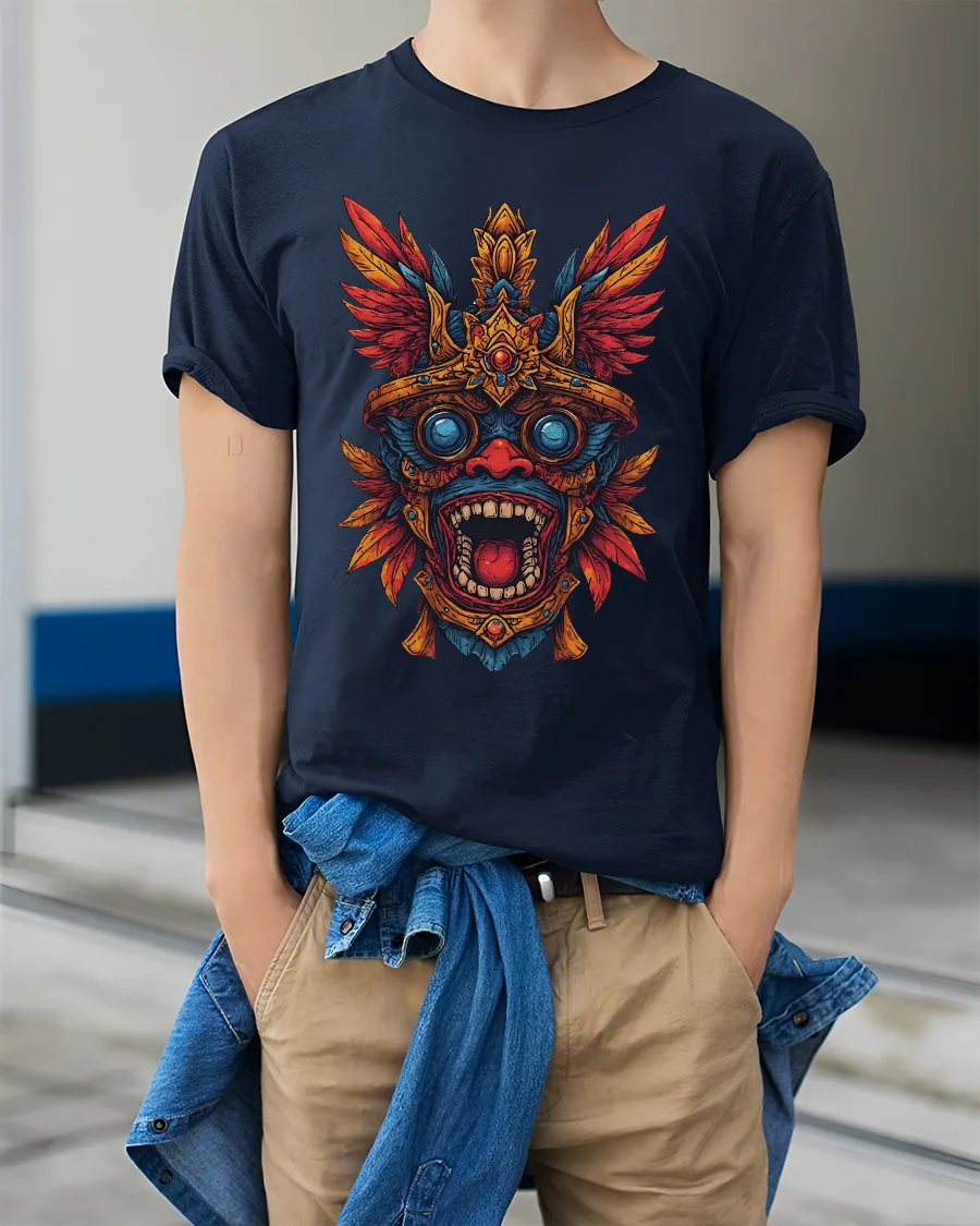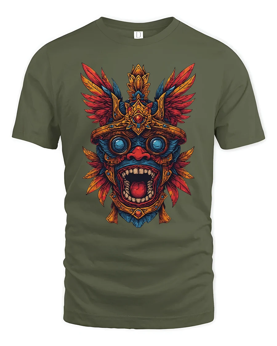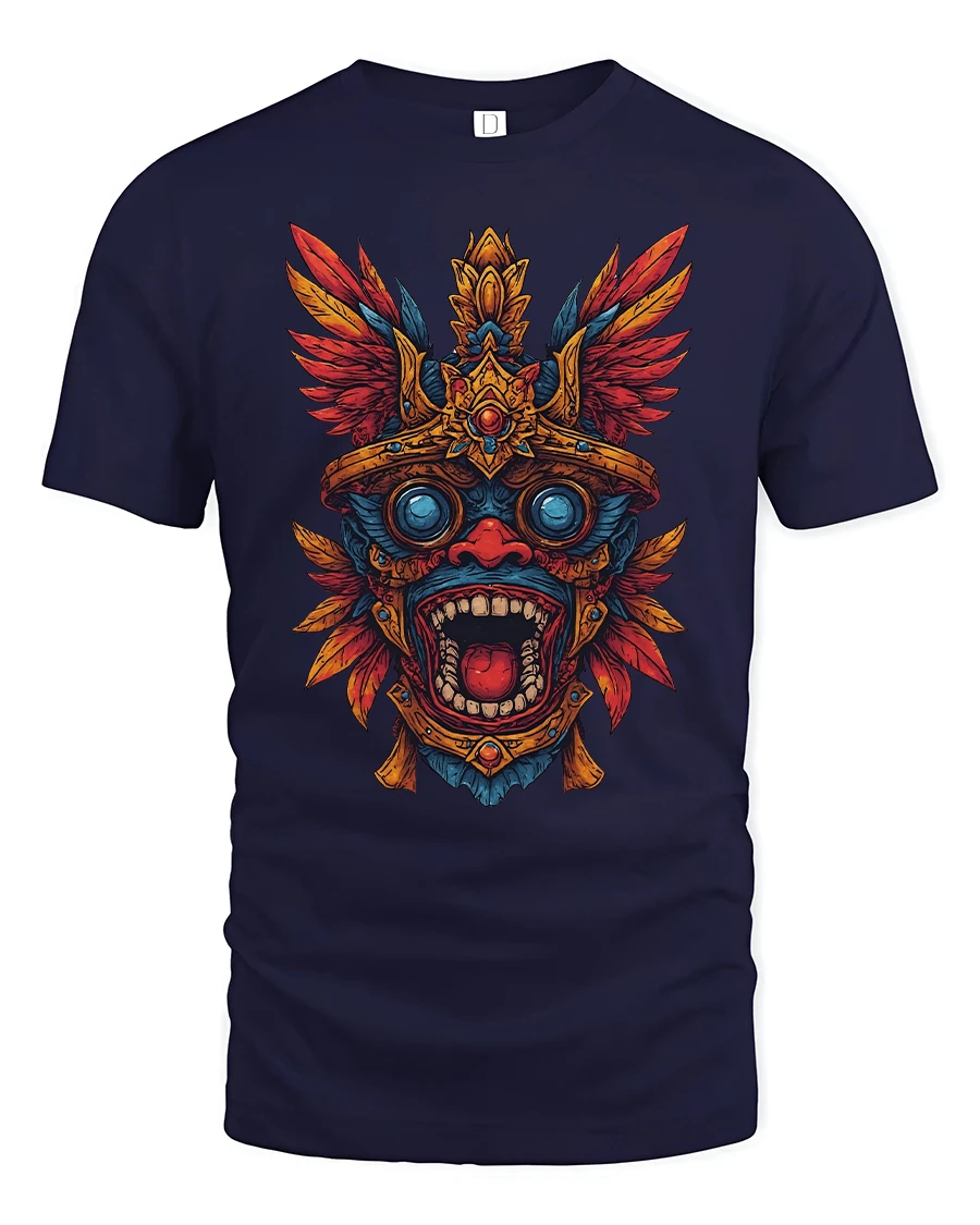 This striking design features a detailed tribal mask inspired by ancient Aztec aesthetics combined with bold colors and intense emotion.