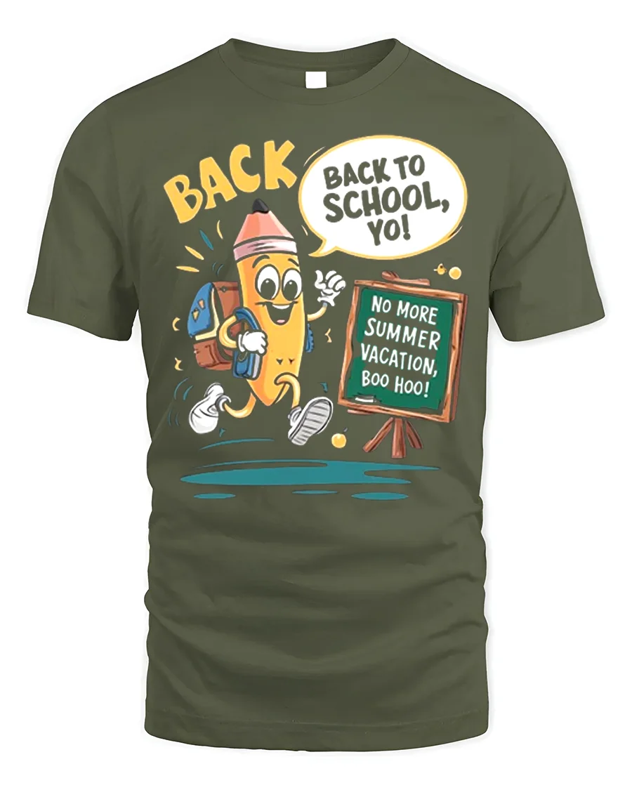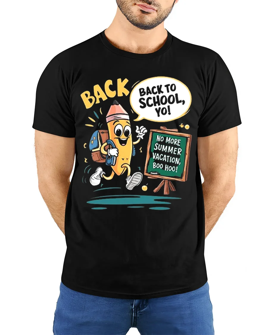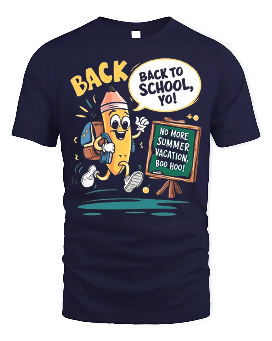 Get a chuckle out of heading back to class with our “Back To School Yo Pencil Tee”! This playful black t-shirt features a lively, running pencil character with a backpack, exclaiming “BACK TO SCHOOL, YO!” alongside a chalkboard sign humorously lamenting “NO MORE SUMMER VACATION, BOO HOO!”. It perfectly captures the mixed emotions of returning to school.