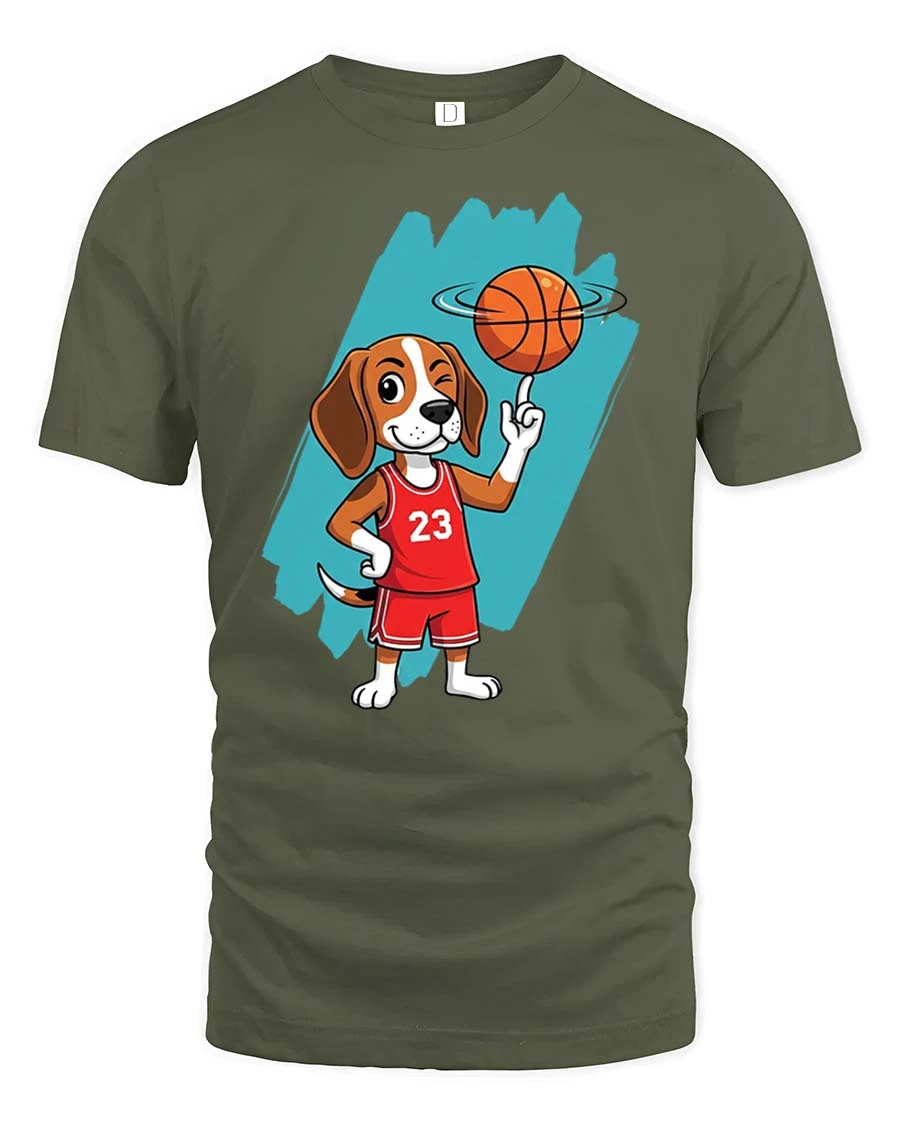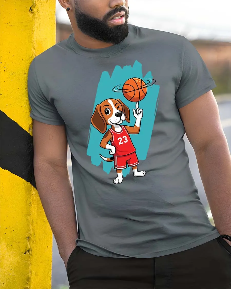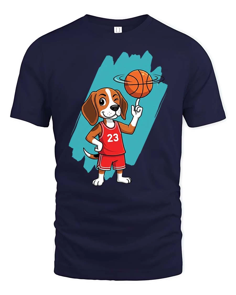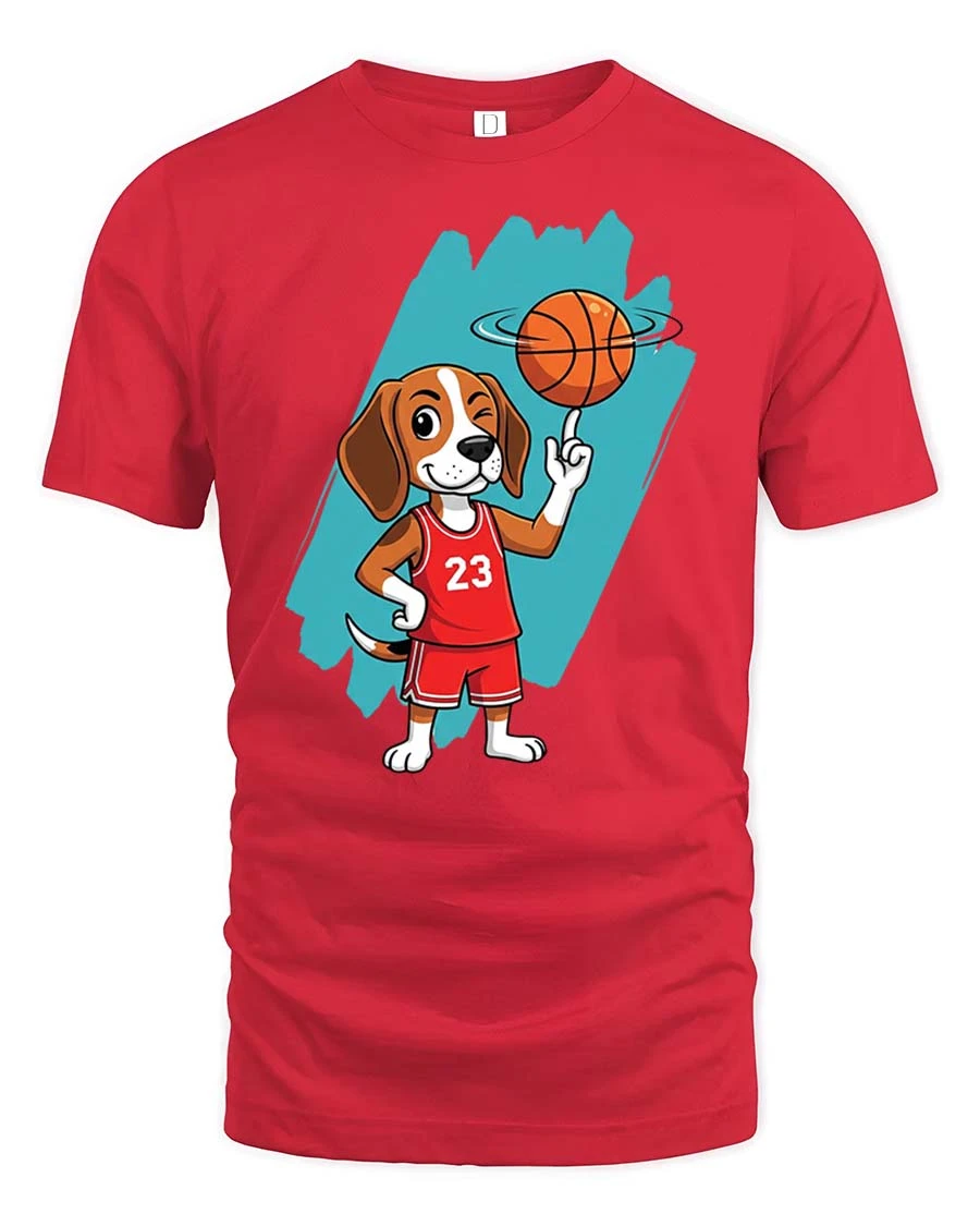 Featuring a cute cartoon dog in a basketball jersey spinning a ball, this t-shirt captures a fun and sporty vibe that stands out.