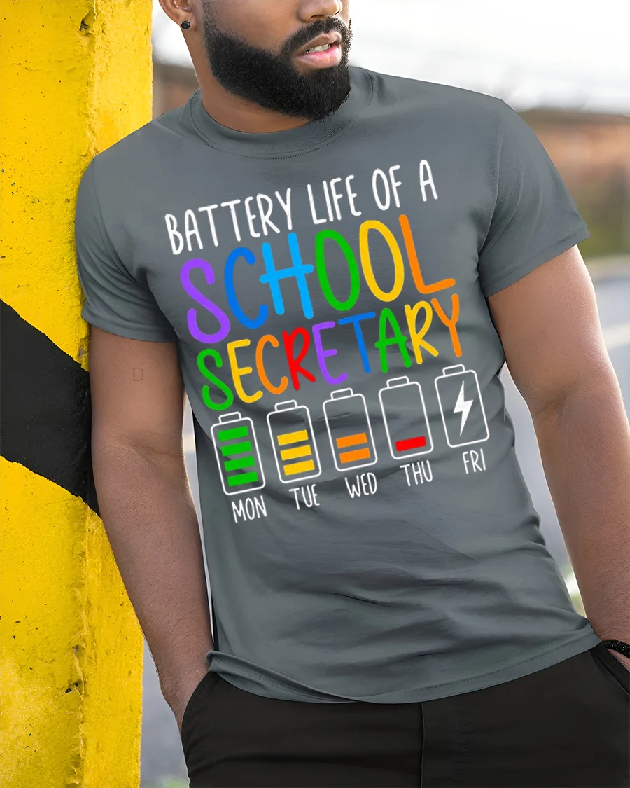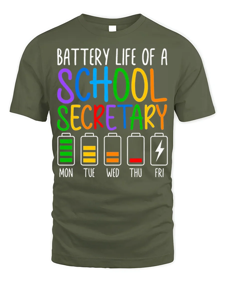 The Battery Life of a School Secretary T-Shirt is an ideal choice for school secretaries, administrative staff, and anyone who works tirelessly behind the scenes to keep a school running smoothly. Its colorful and eye-catching design adds a touch of fun to your wardrobe, making it perfect for casual Fridays, school events, or staff appreciation days.
