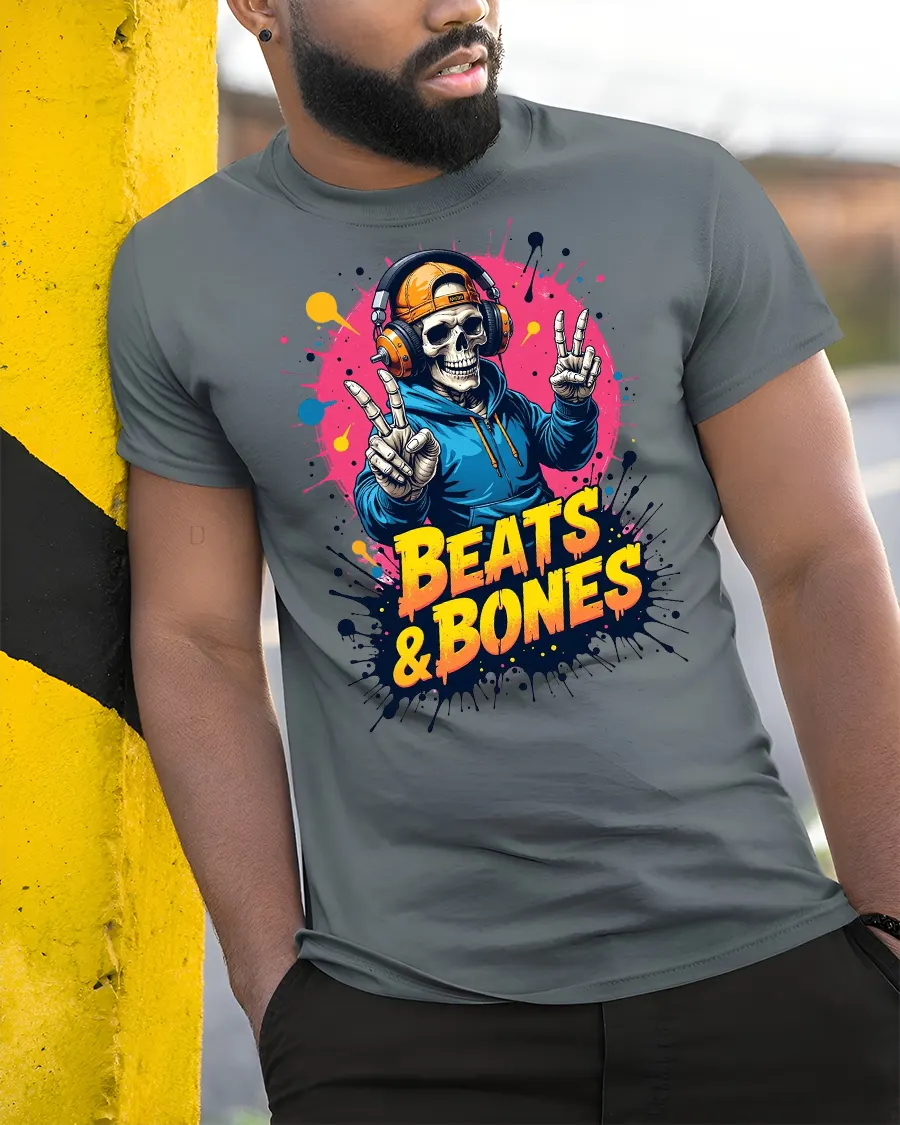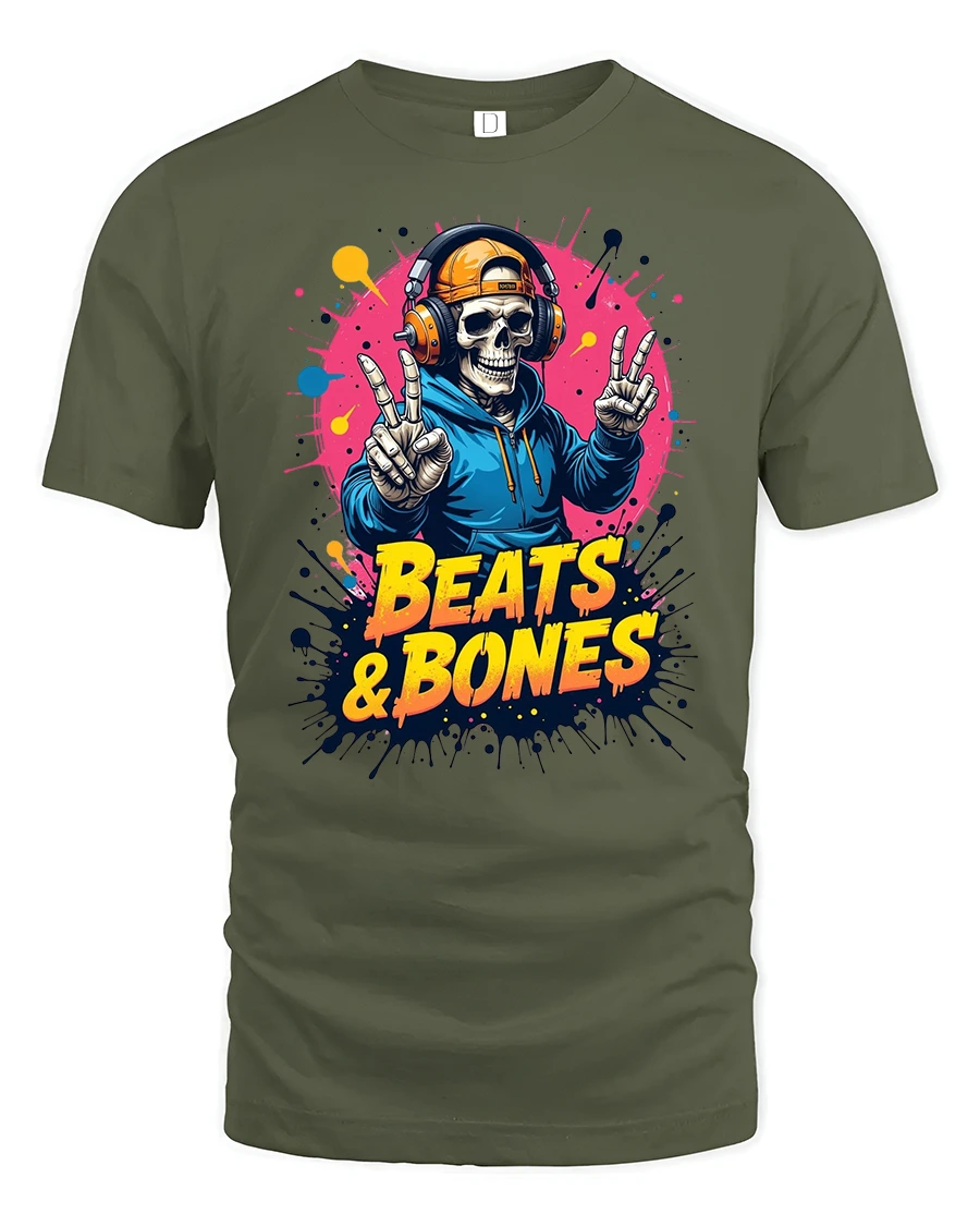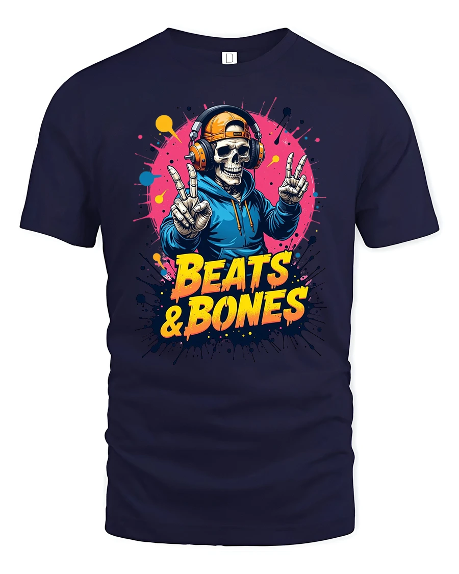 Beats & Bones Skull DJ Graphic T-Shirt for Music Fans is the perfect choice for anyone who loves music, streetwear, and bold graphic designs. Featuring a cool skeleton rocking headphones, hoodie, and cap with vibrant colors and graffiti splashes, this shirt captures the urban hip hop vibe while staying fun and edgy. The “Beats & Bones” text adds an extra punch, making it a standout piece for concerts, festivals, and casual street style.