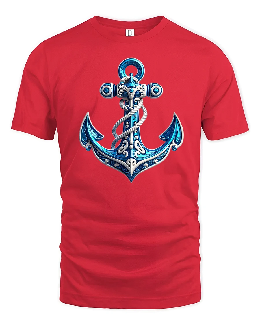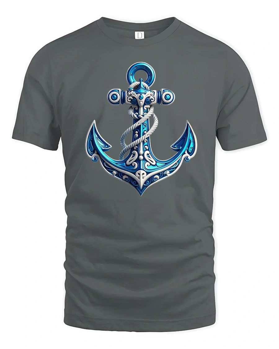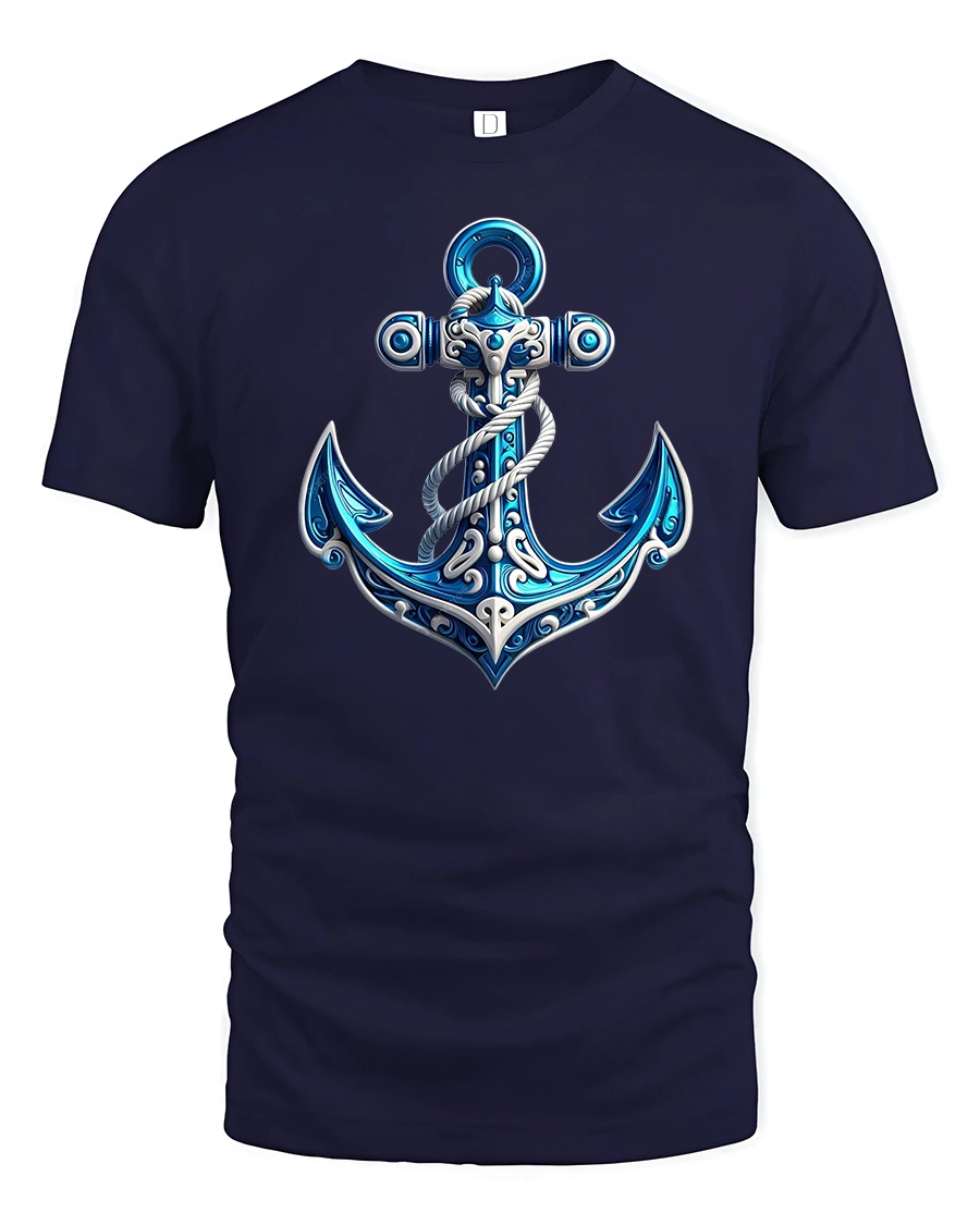 This striking tee features a beautifully detailed blue anchor wrapped in rope, symbolizing strength, stability, and adventure.