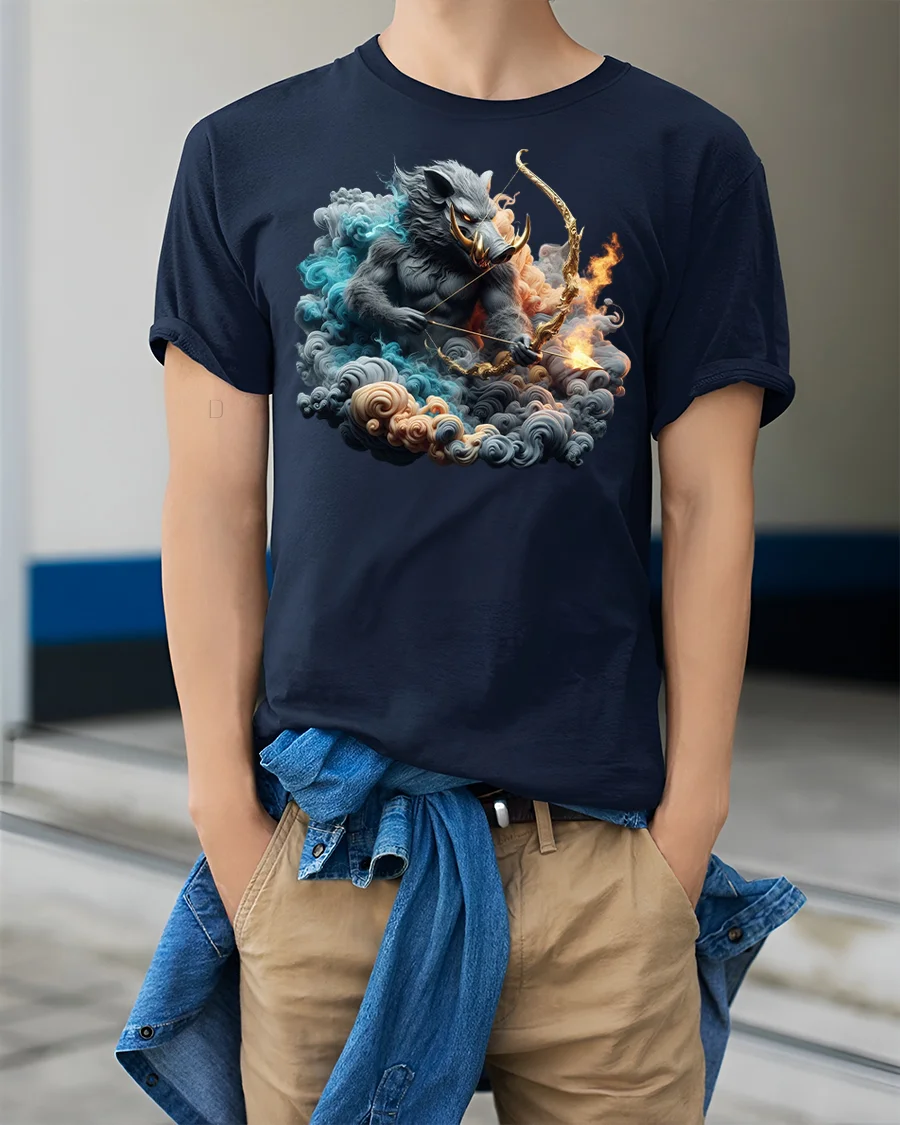 Featuring a fierce warrior boar drawing a flaming bow amid swirling clouds of fire and ice, this design symbolizes balance, precision, and primal strength.