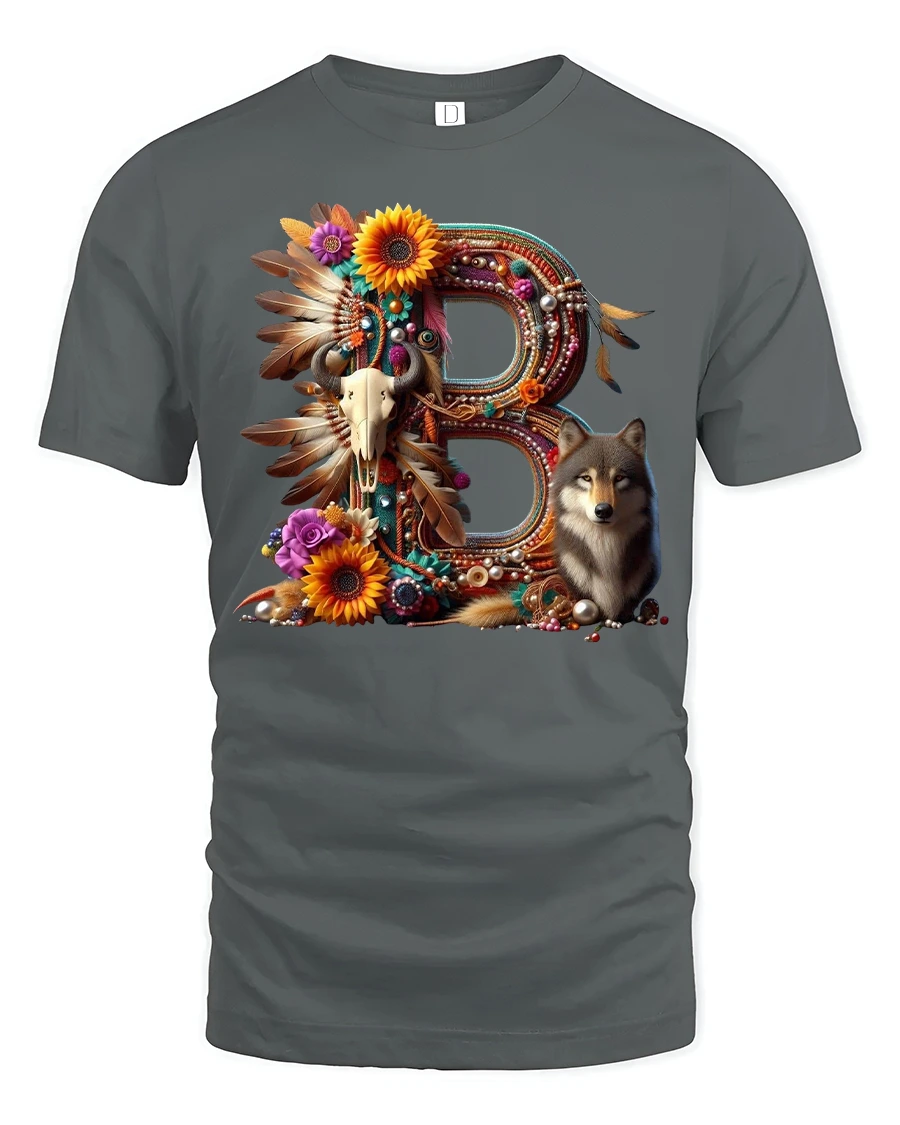 Boho Letter B Wolf Skull Floral Art Graphic Tshirt Nature Tee blends artistic expression with nature inspired symbolism.