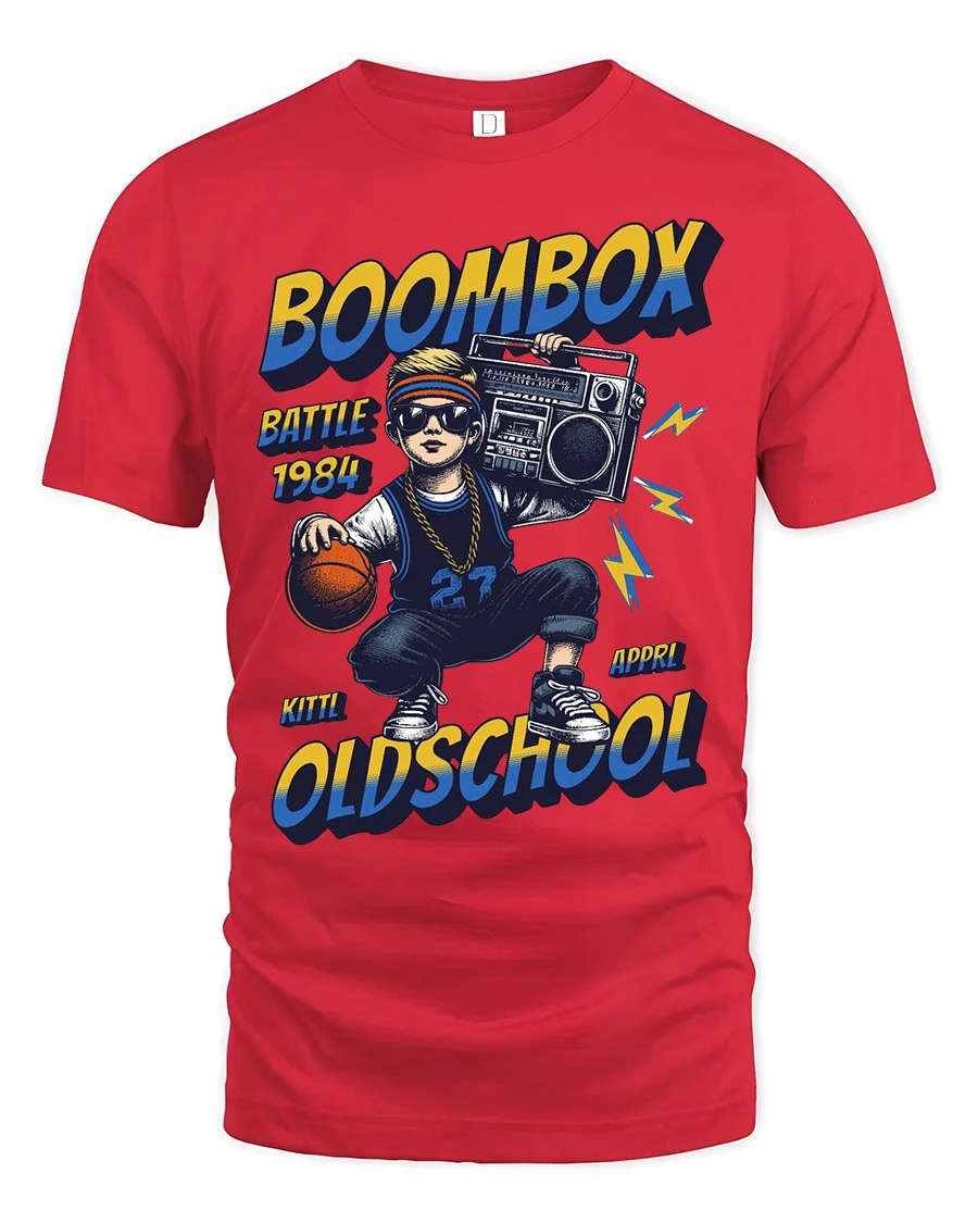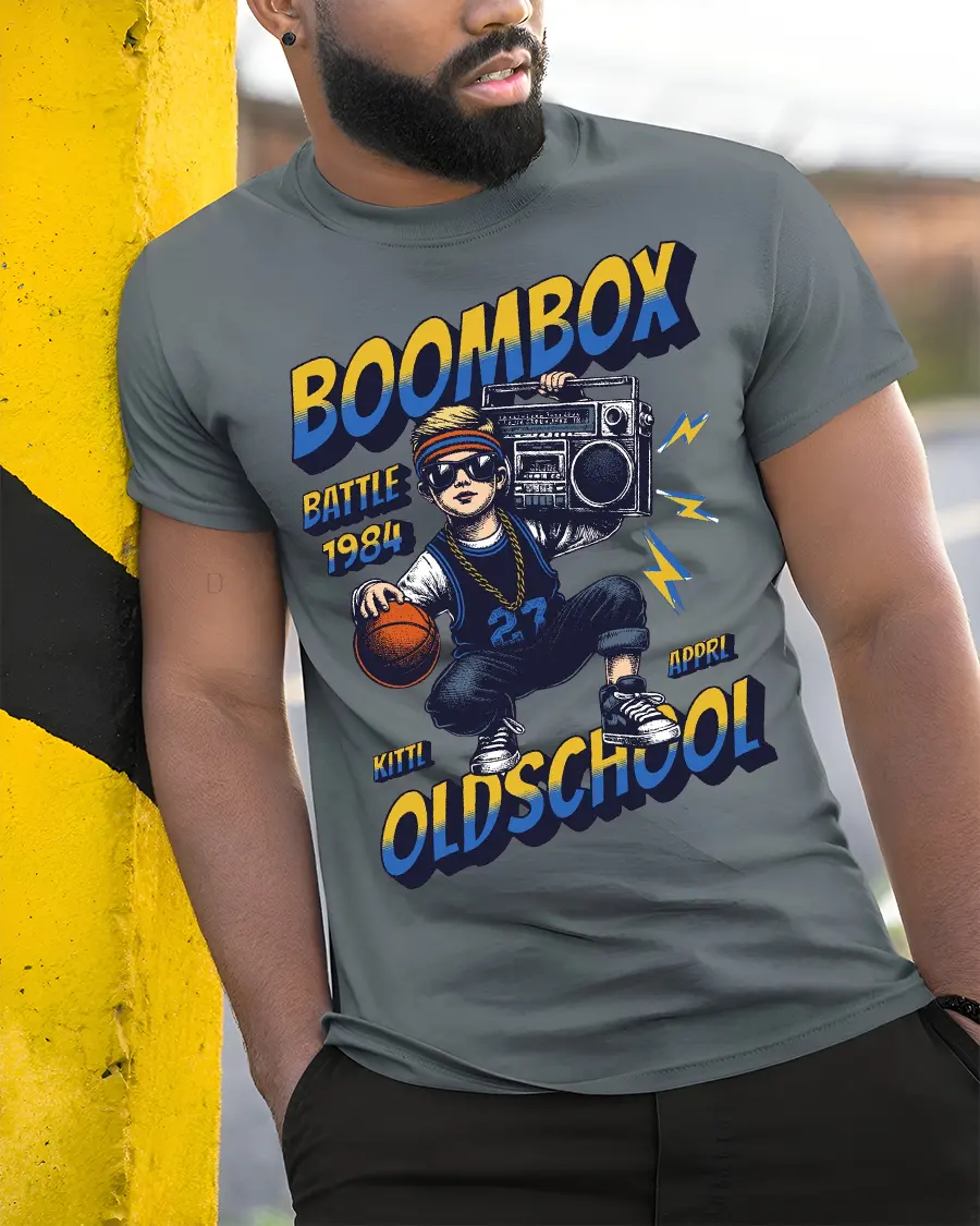 Featuring a confident oldschool character holding a boombox and basketball, this boombox t shirt captures the spirit of eighties hip hop and urban style.