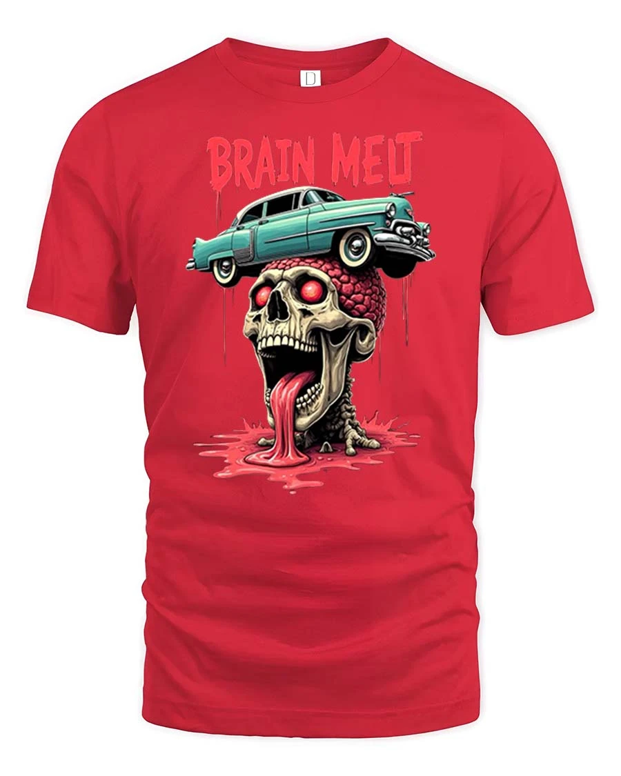 Brain Melt Skull Horror Retro Car Graphic Dark Art T-Shirt - red t-shirt on white background