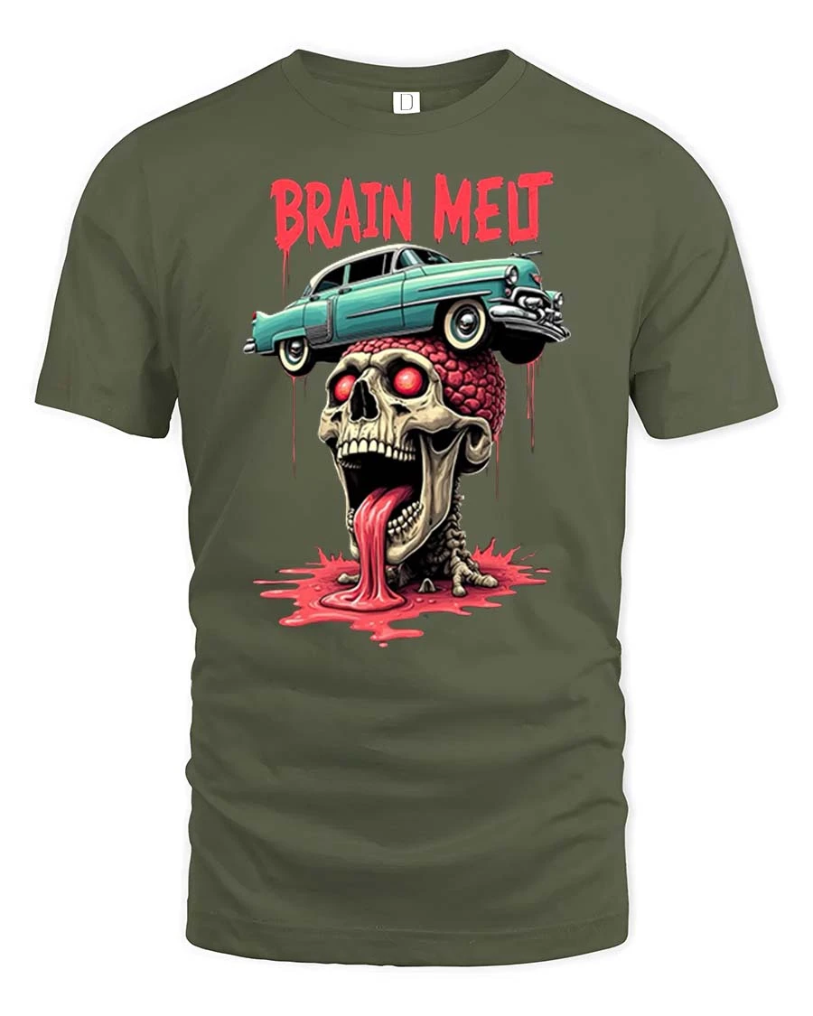 Brain Melt Skull Horror Retro Car Graphic Dark Art T-Shirt - military green t-shirt on white background