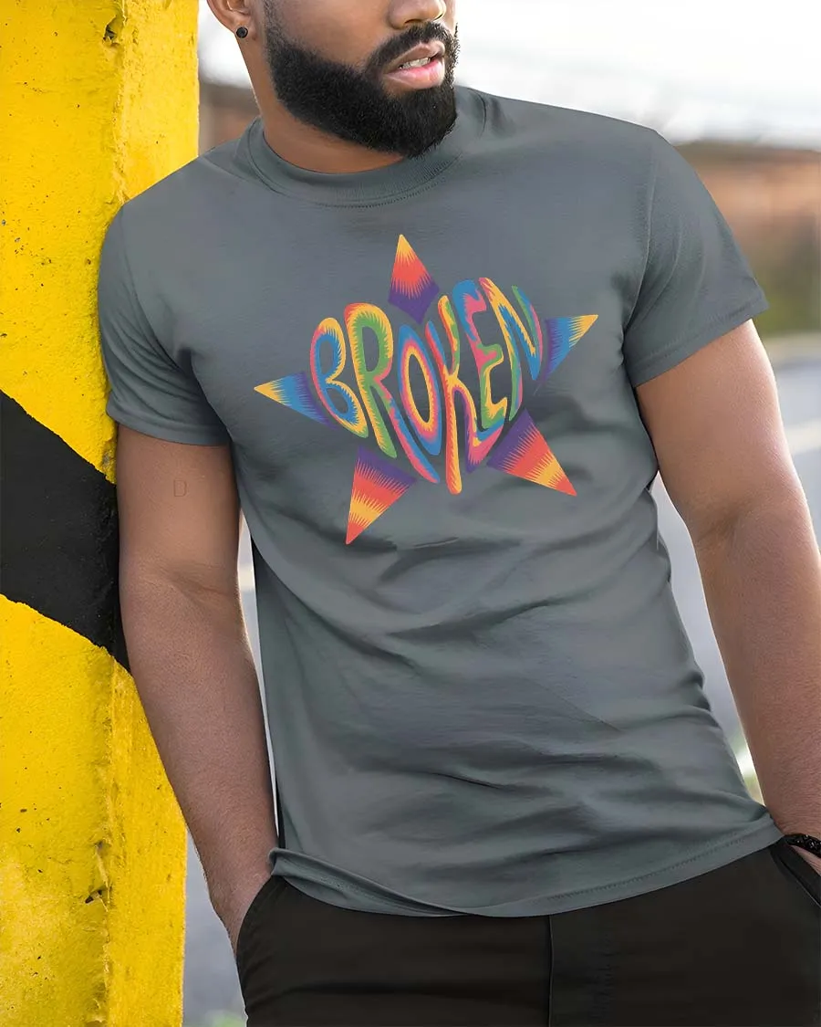 Featuring a vibrant “broken” text set against a colorful star backdrop, this graphic creates a striking and artistic look that stands out instantly.