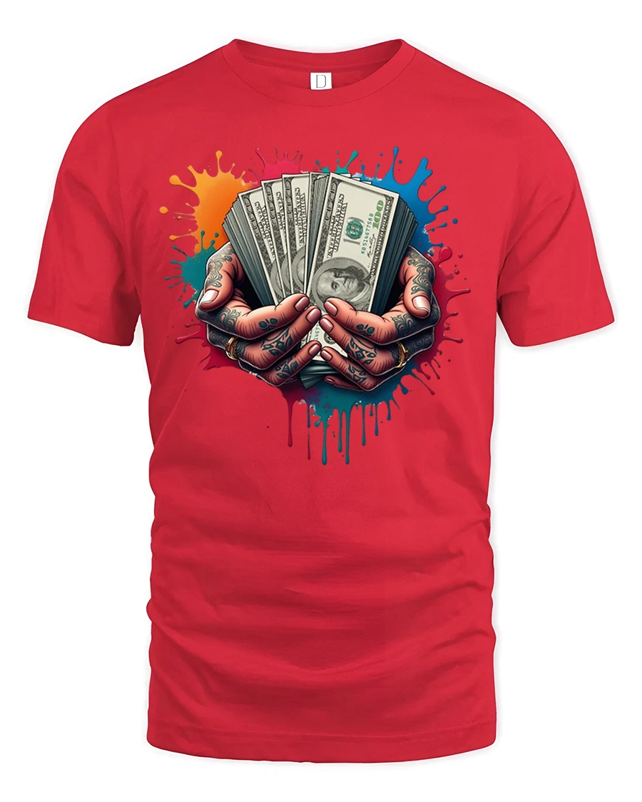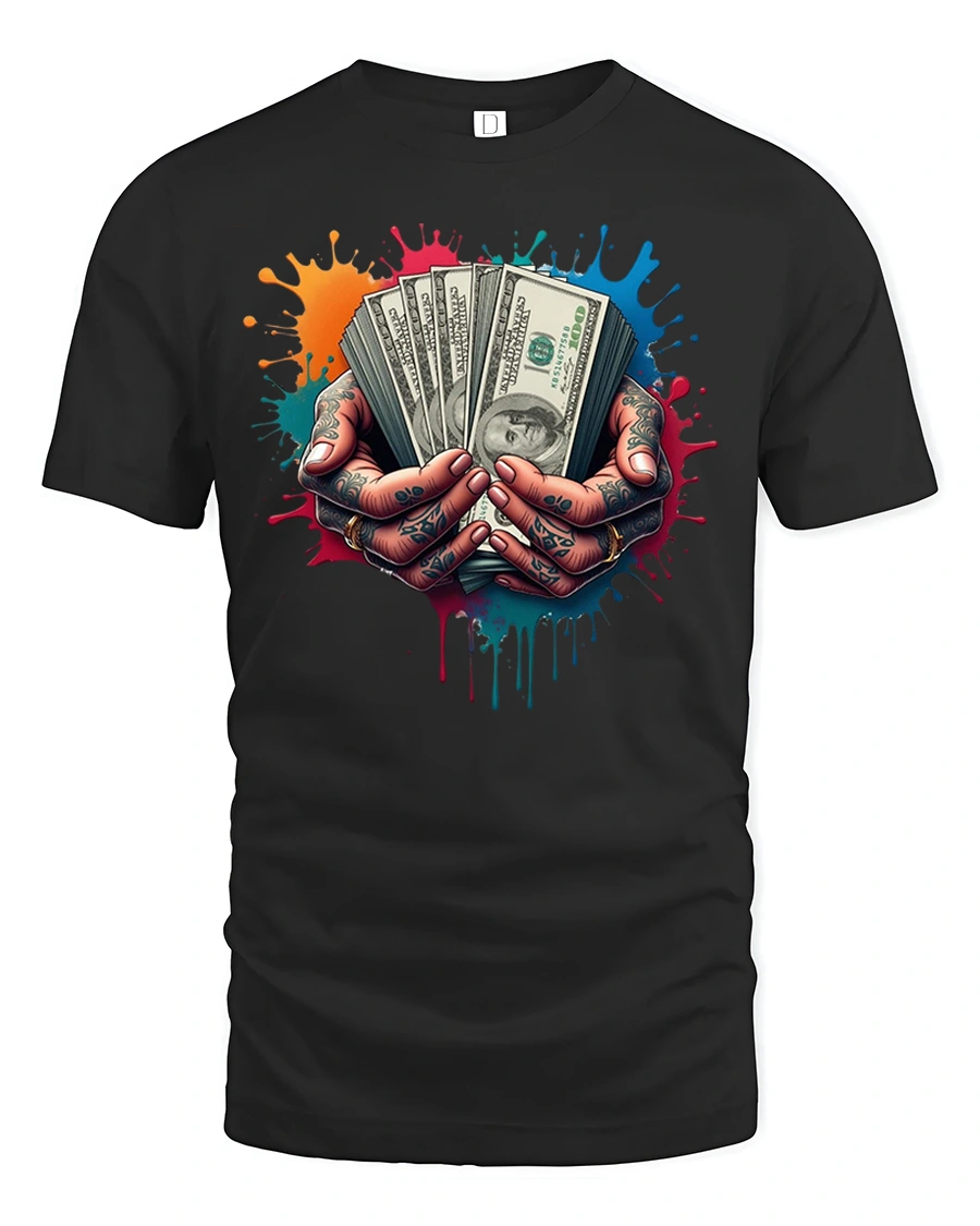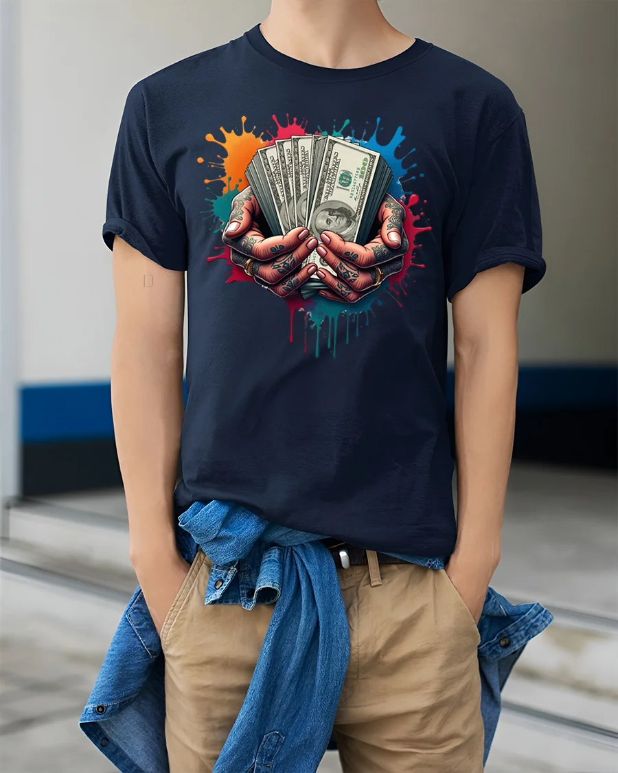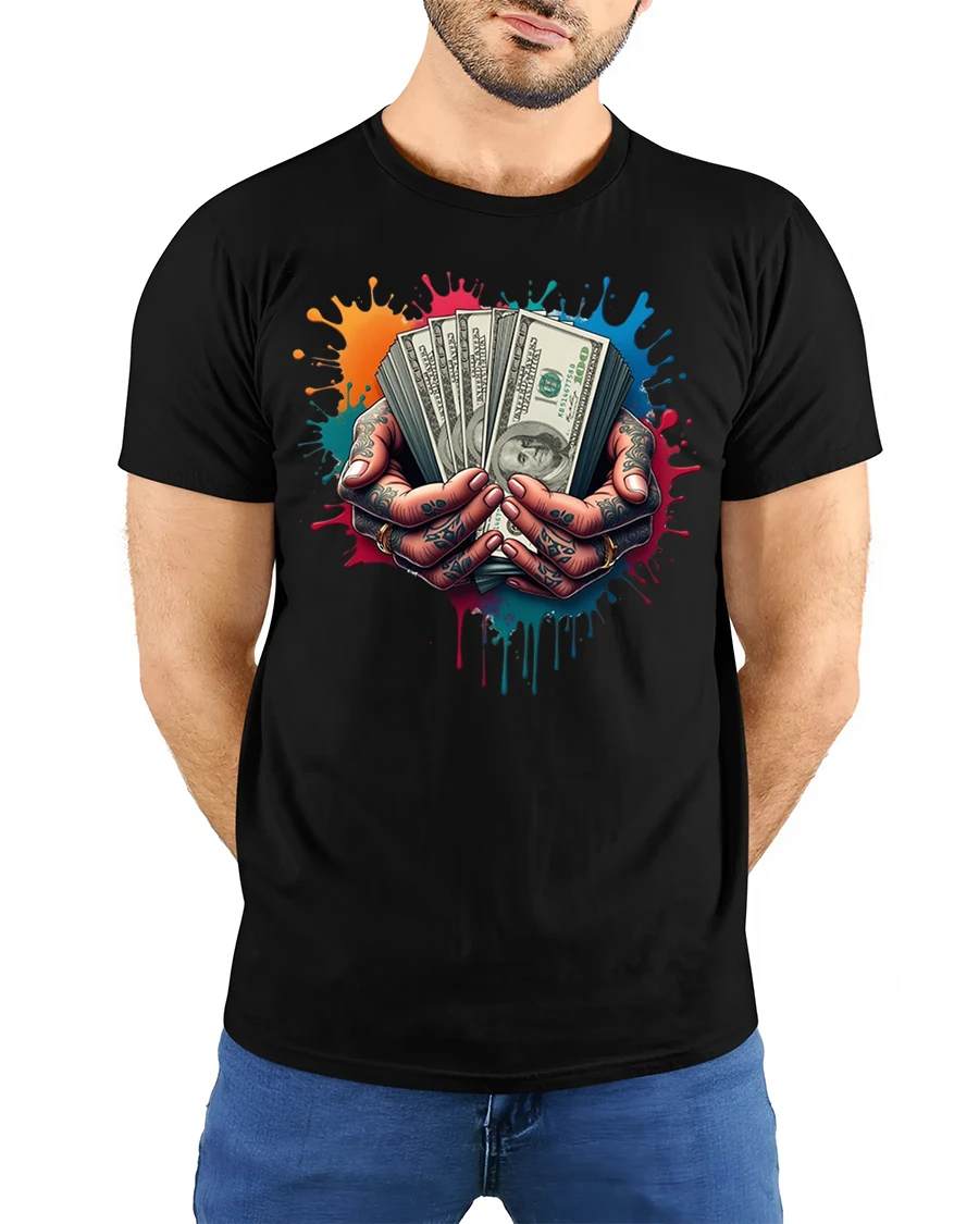 Cash in Hand Tattoo Style Money Graphic Print T-shirt is the perfect choice for anyone who loves bold streetwear with an edge. Featuring a striking design of tattooed hands holding stacks of hundred-dollar bills against a splash of colorful paint, this shirt delivers a powerful statement of hustle, grind, and confidence. It’s the ultimate look for those who live by ambition and street-smart style.
