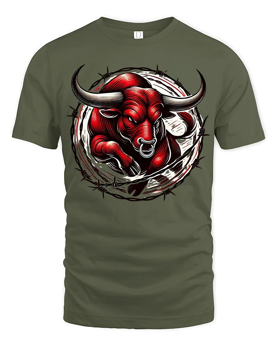 Charging Red Bull Barbed Wire Graphic T-shirt is the ultimate choice for those who love bold and fearless fashion. Featuring a striking red bull breaking through barbed wire, this tee is designed to symbolize strength, power, and unstoppable energy. The detailed artwork and vibrant red tones create a standout look that instantly grabs attention.