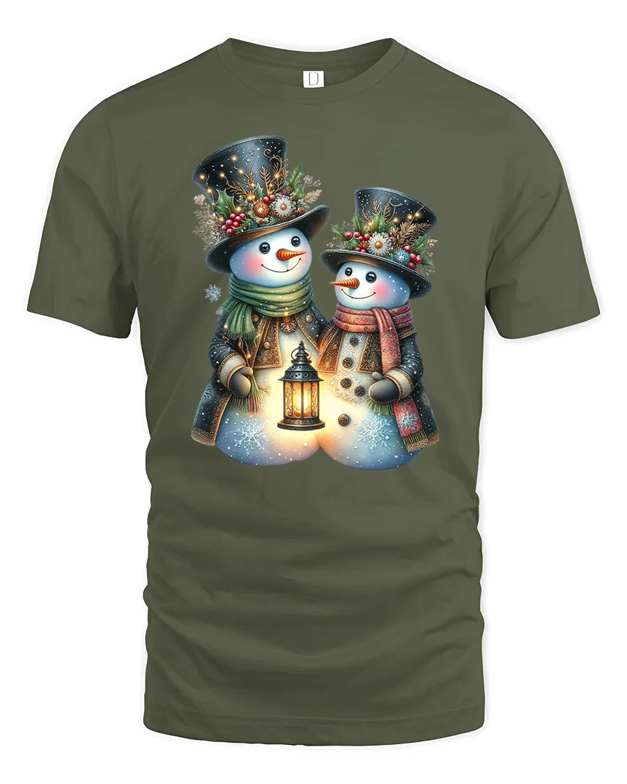 Charming Snowman Couple Tee with Cozy Winter Lantern Artwork brings warmth and joy to the holiday season with a beautifully illustrated snowman pair. Dressed in festive scarves and decorated top hats, the two snowmen share a glowing lantern that lights up the artwork with a soft and magical winter ambiance. Their cheerful expressions and the intricate floral winter details make this tee visually captivating and heartwarming.