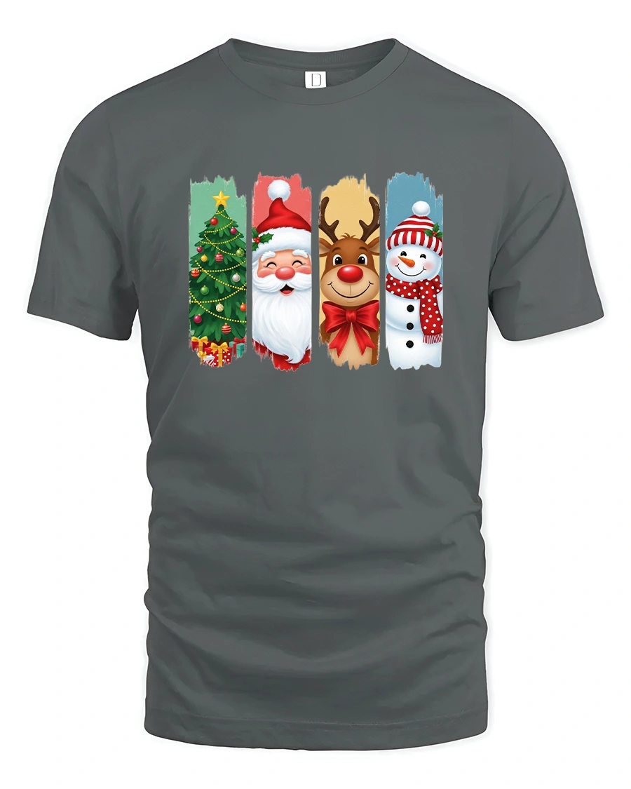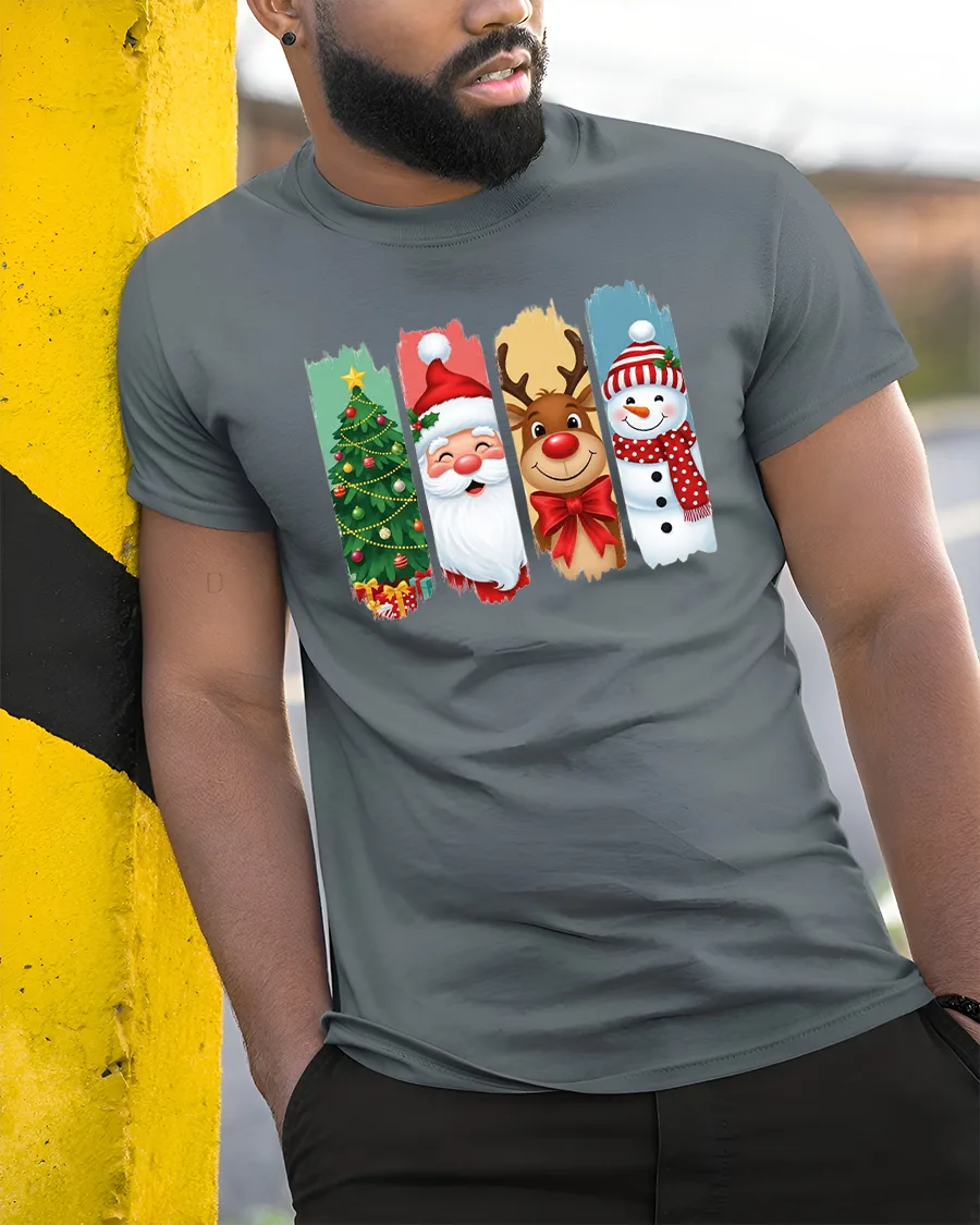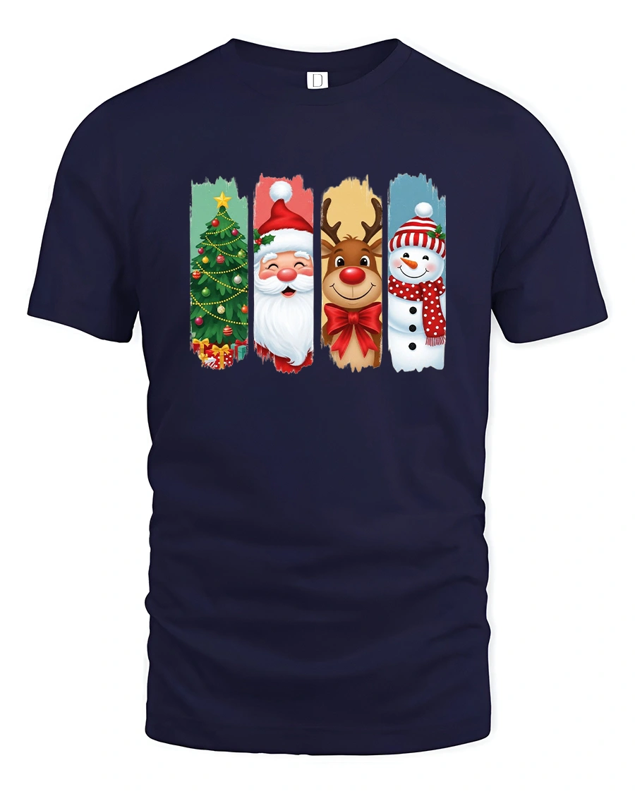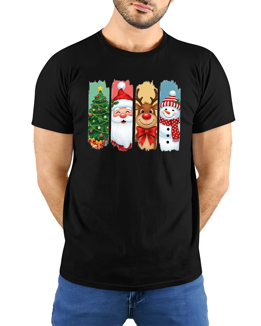 Bring joyful holiday energy to your wardrobe with this christmas character t shirt featuring a cheerful lineup of classic seasonal icons.