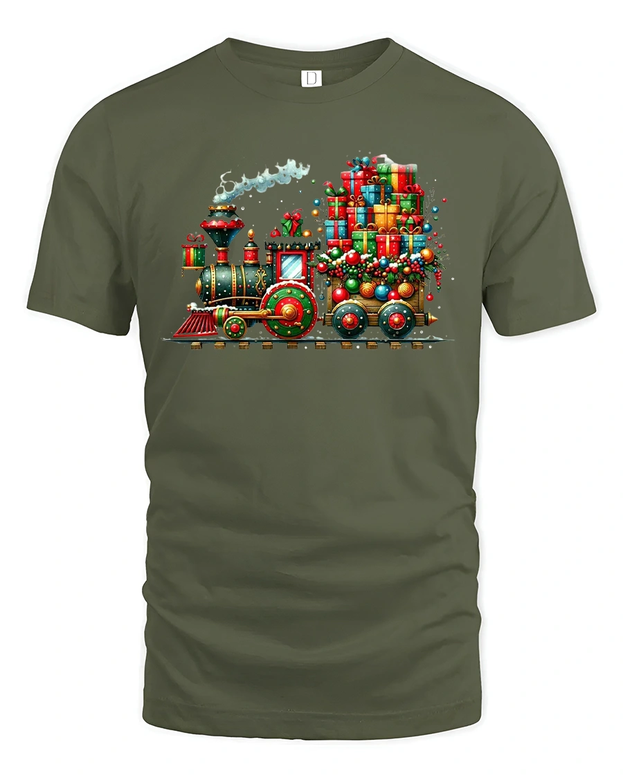 Christmas Gift Train Tee with Colorful Holiday Locomotive Art brings festive cheer to life through a vibrant and detailed holiday illustration. The design features a charming steam locomotive decorated in classic Christmas colors, pulling a stacked load of beautifully wrapped presents. Bright ornaments, lush greenery, and glowing accents add warmth and excitement to the eye-catching artwork.