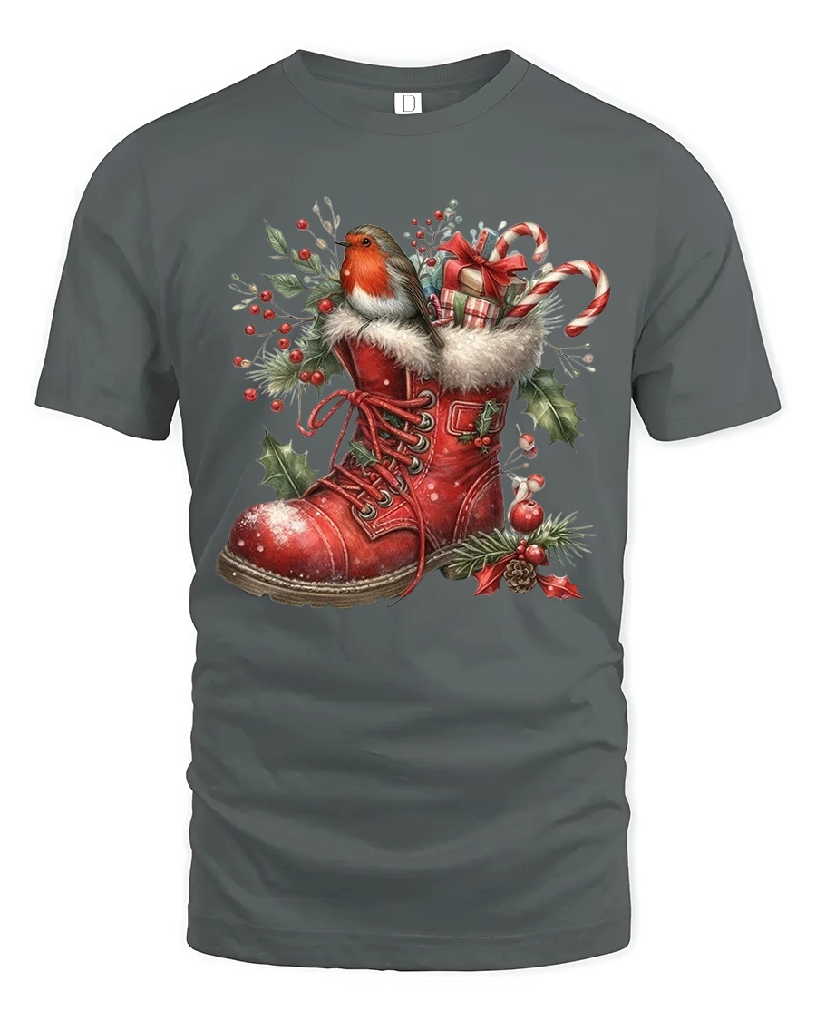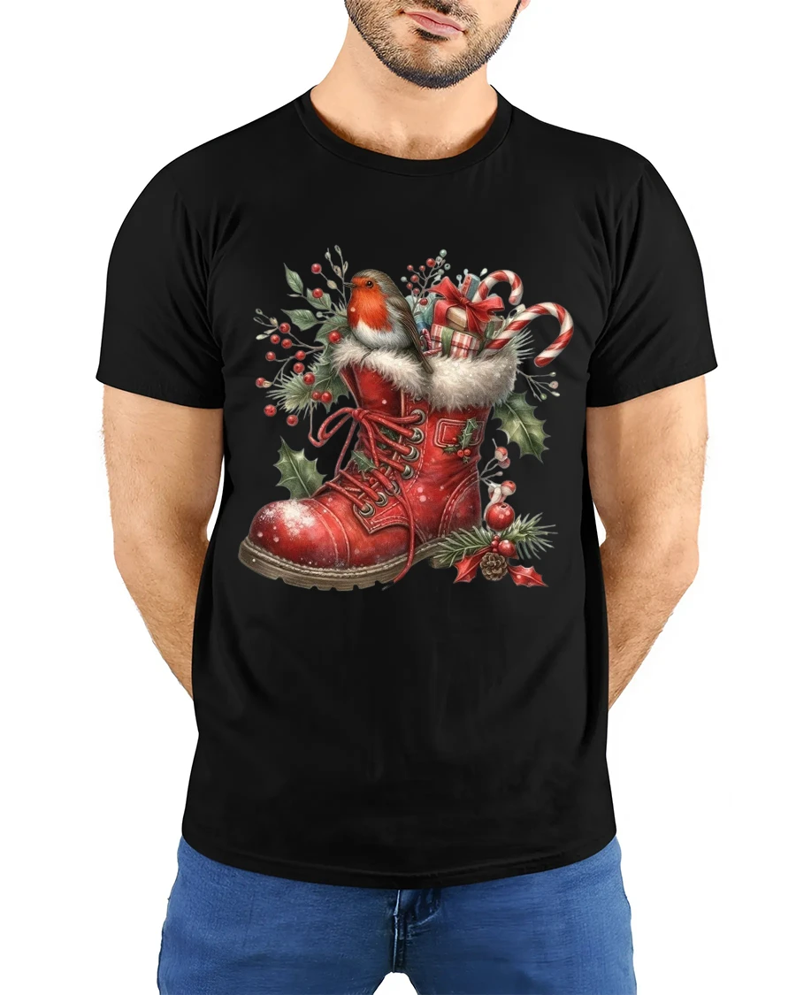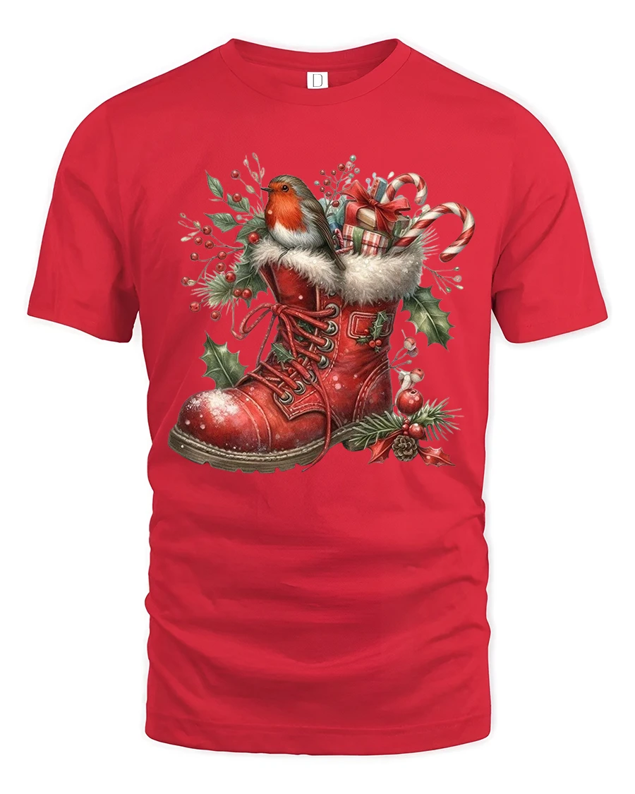 Christmas Robin Boot Art T Shirt celebrates the beauty of winter nature and classic holiday storytelling.