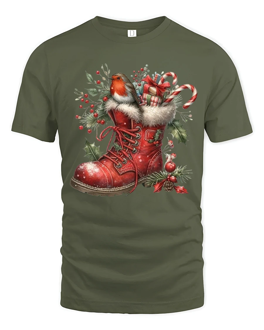 Christmas Robin Boot Art T Shirt captures cozy holiday charm with a heartwarming winter illustration full of festive detail.