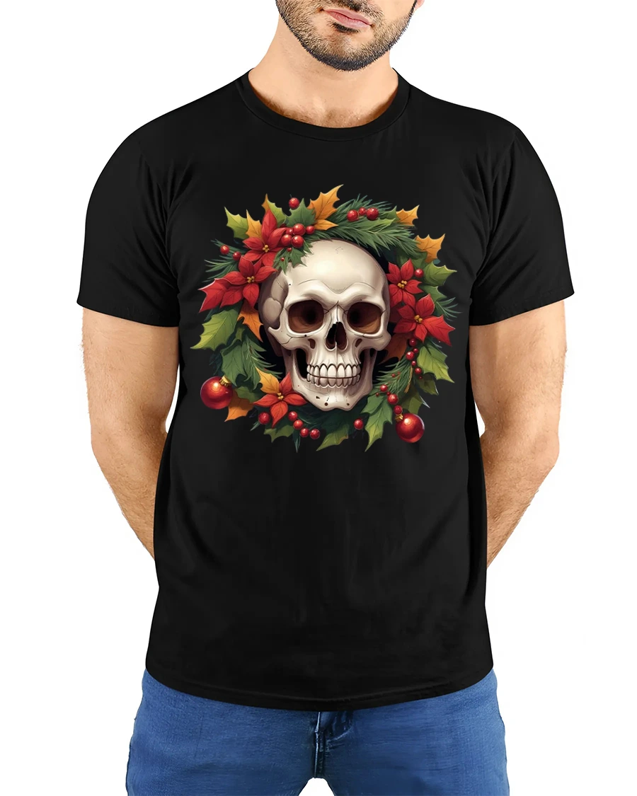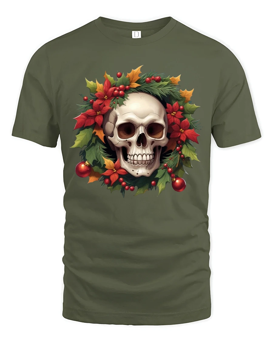 Christmas Skull Wreath Art Tshirt combines festive charm with a bold gothic twist.