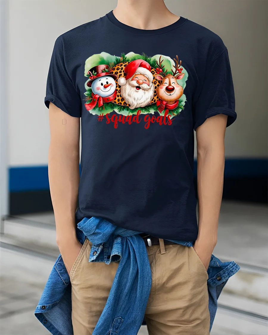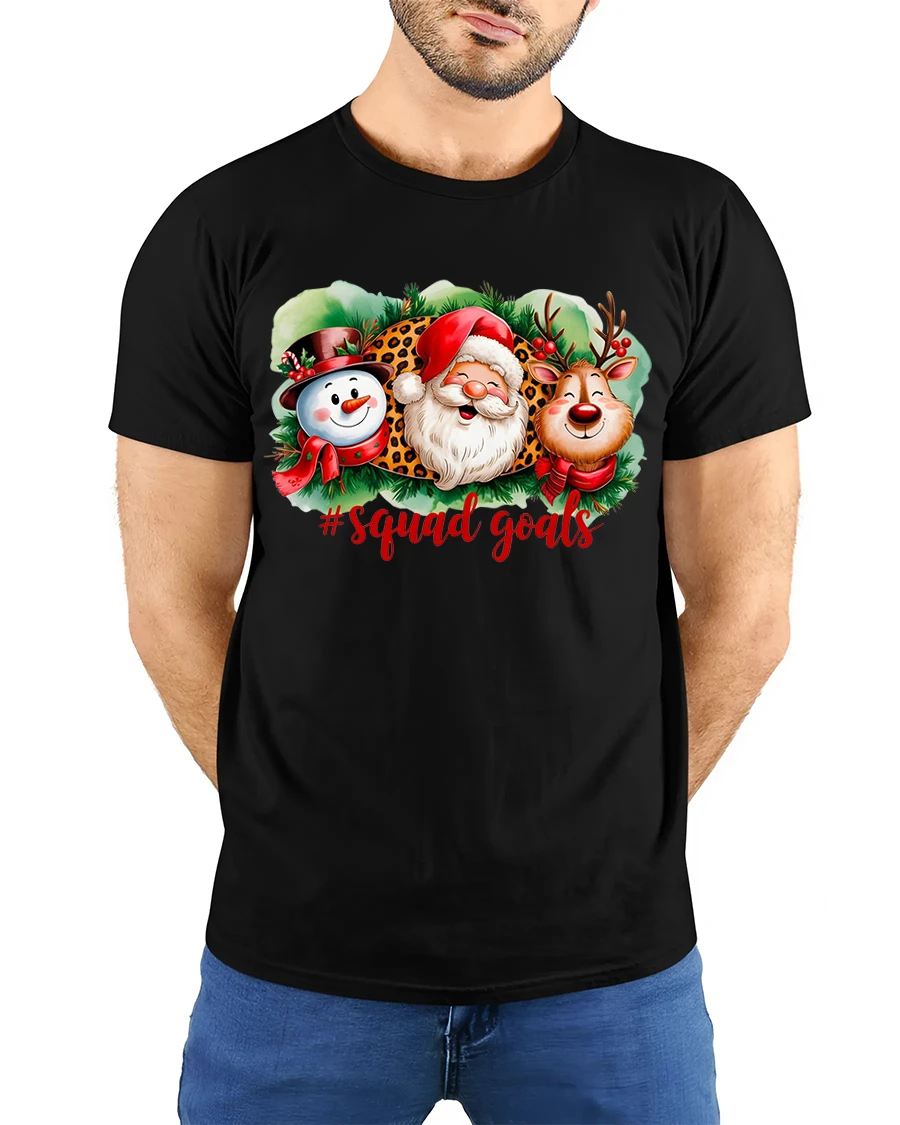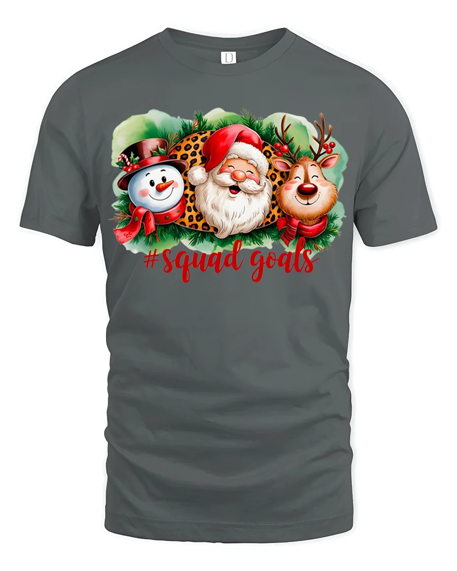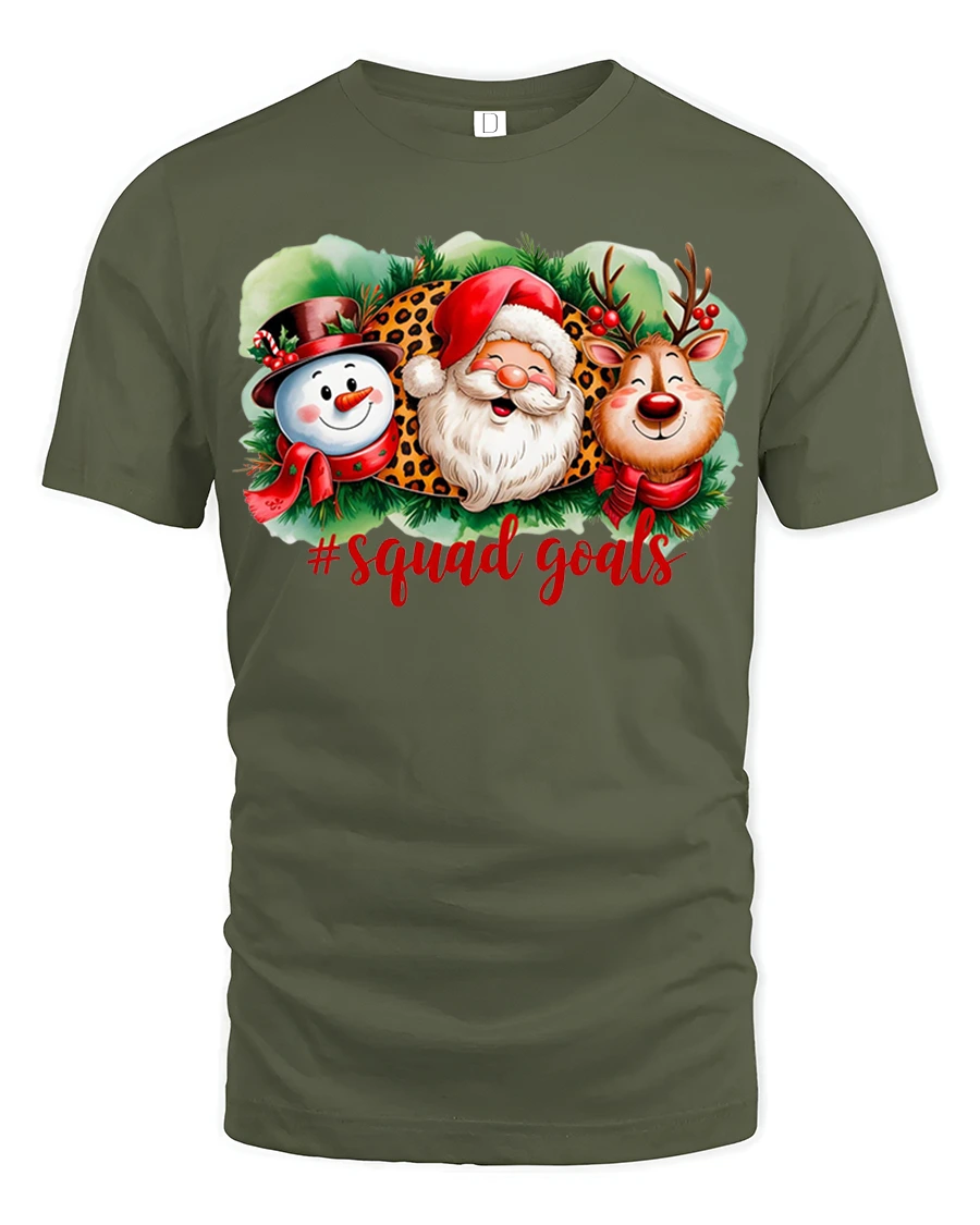 This Christmas Squad Goals Santa Reindeer Snowman Fun T-Shirt brings joyful holiday spirit to life with a playful trio of Christmas favorites. Featuring a smiling snowman, jolly Santa and a cheerful reindeer all gathered together in festive greenery, the design highlights the perfect holiday squad. The bold red “#squad goals” text adds a fun modern twist that makes the shirt both trendy and full of Christmas charm.