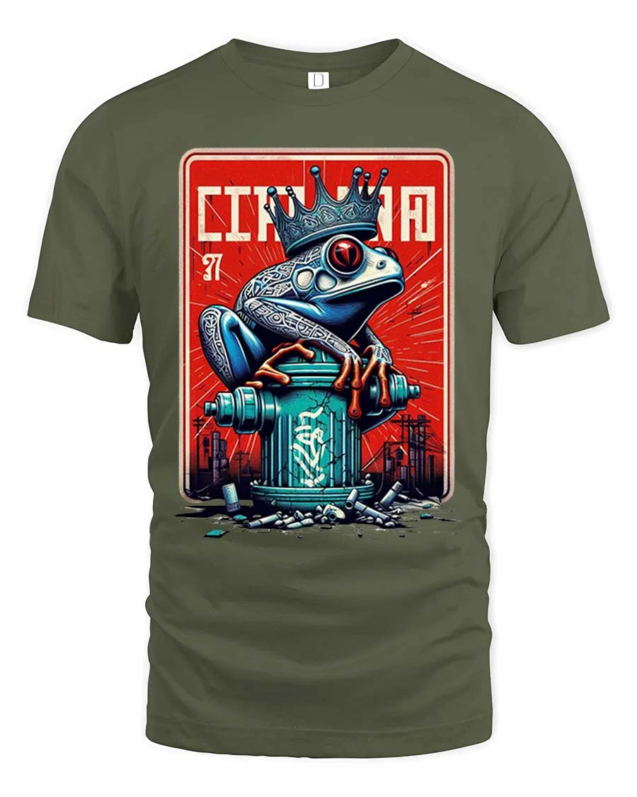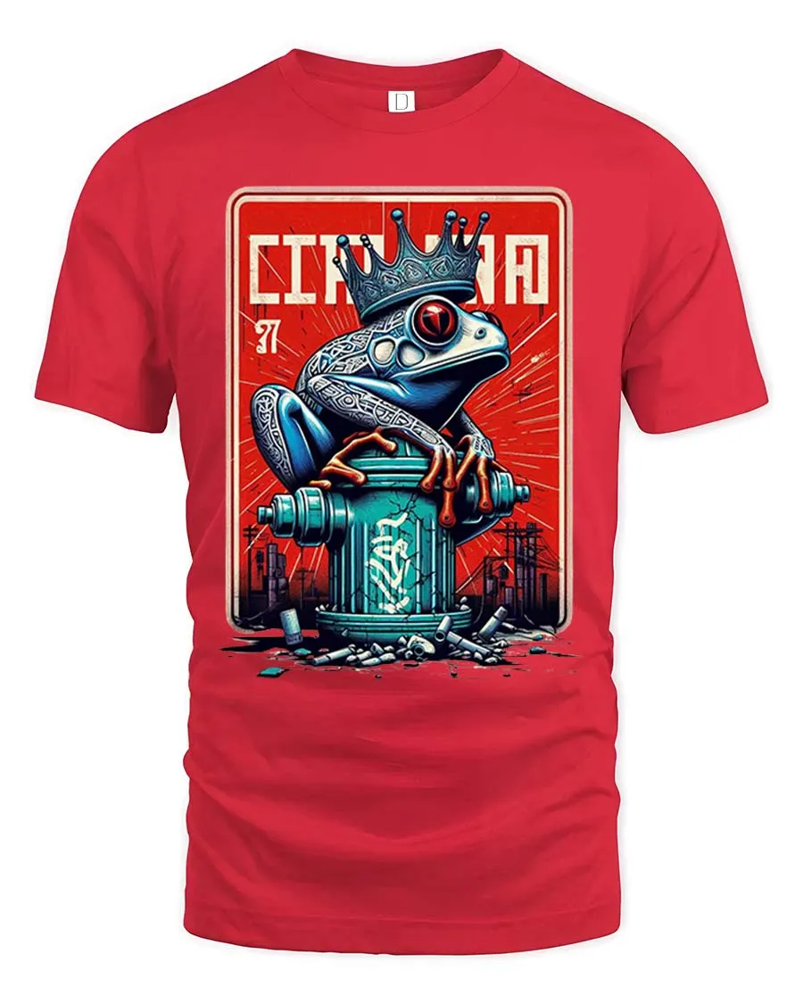 The Cincinnati Frog King T-Shirt features a bold graffiti-style frog wearing a crown, creating a striking urban street art design.