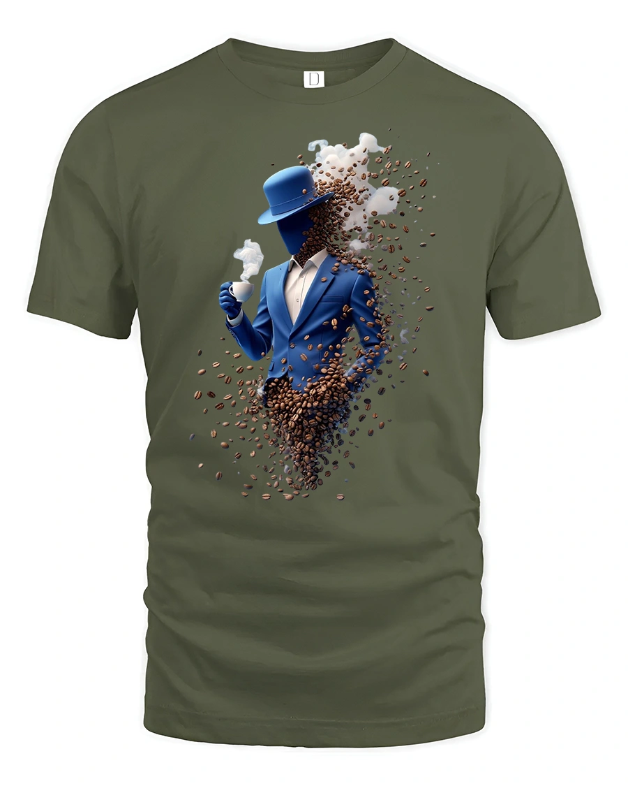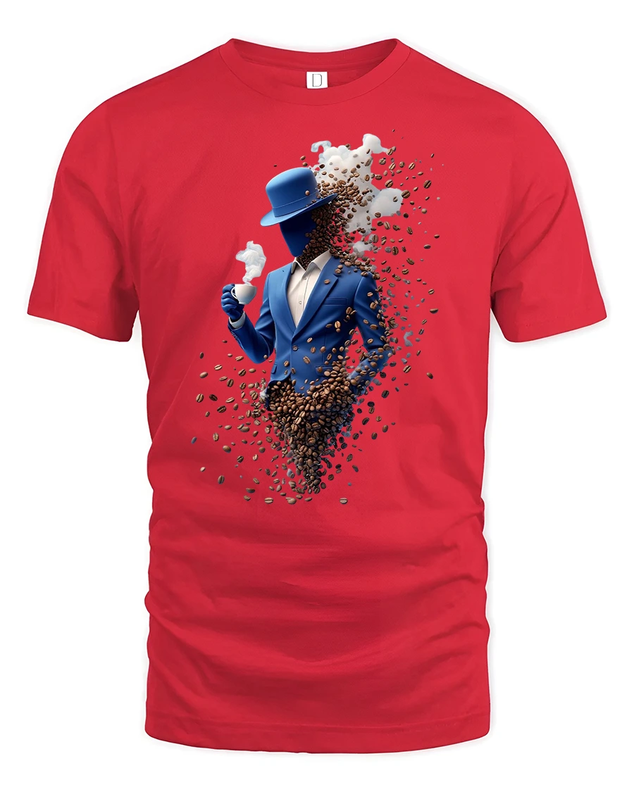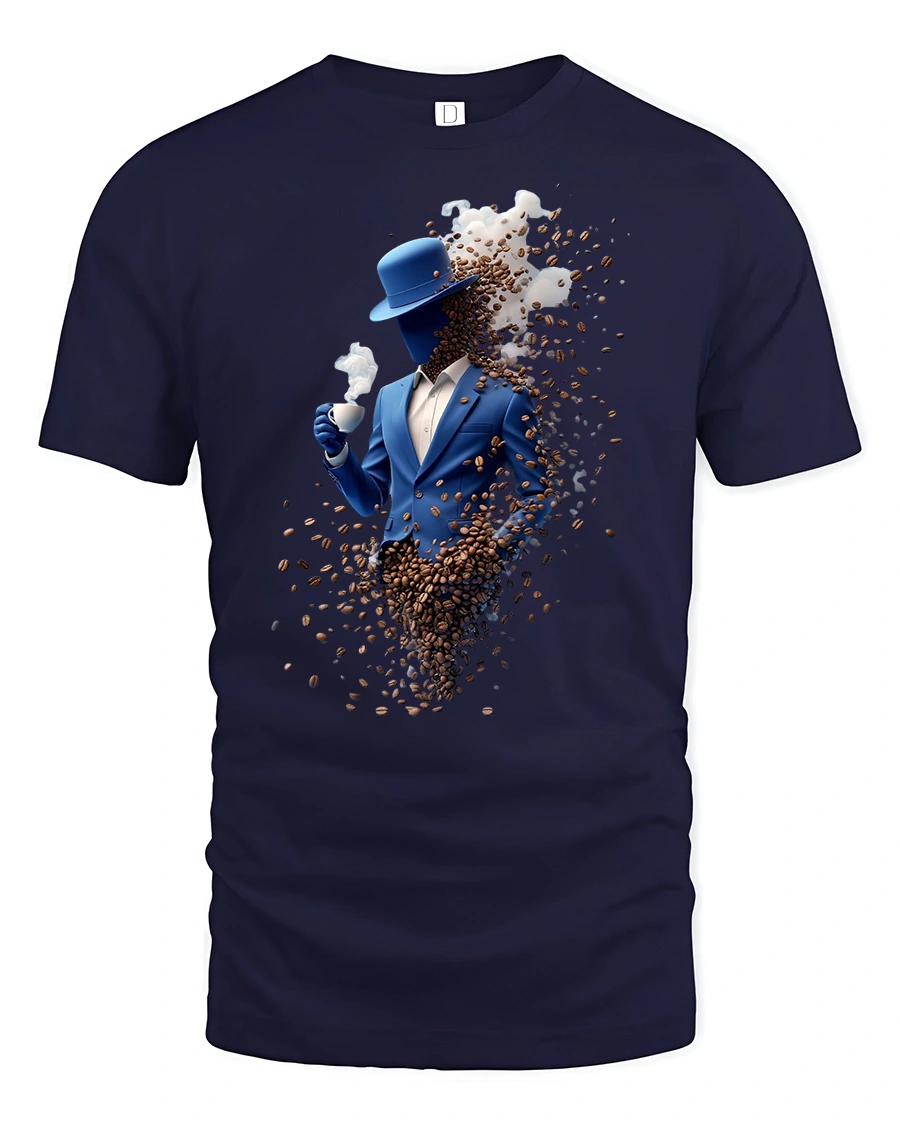 Featuring an elegant figure in a blue suit dissolving into a swirl of aromatic coffee beans and steam, this shirt perfectly captures the passion of caffeine and creativity.