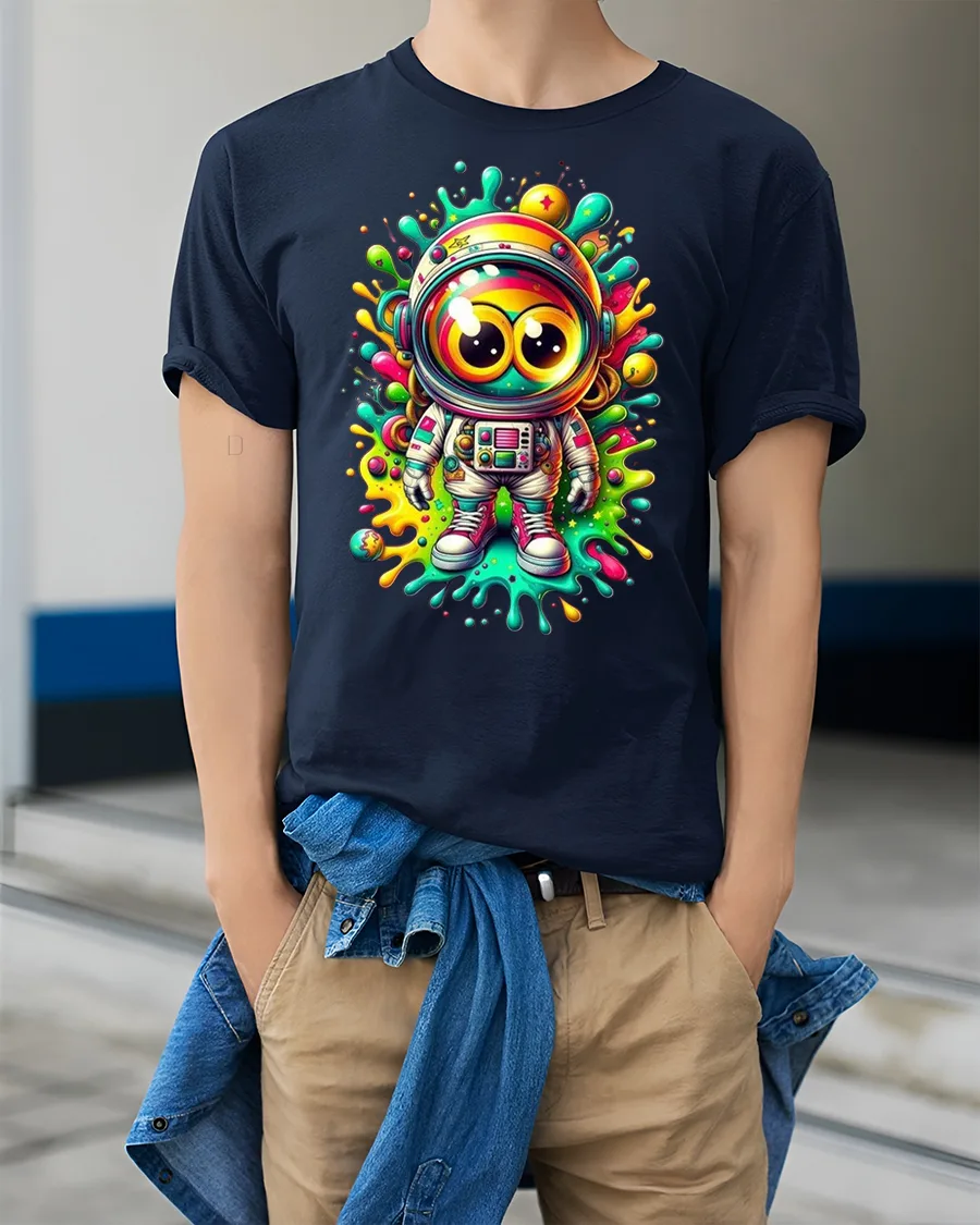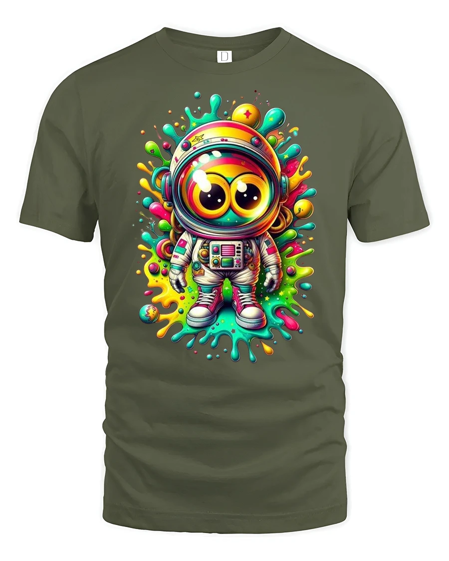 Color Splash Astronaut Tee with Cute Space Graphic is the perfect blend of cosmic wonder and playful style. Featuring a wide-eyed astronaut surrounded by vibrant neon splashes, this tee brings a fun and futuristic vibe that stands out wherever you go.