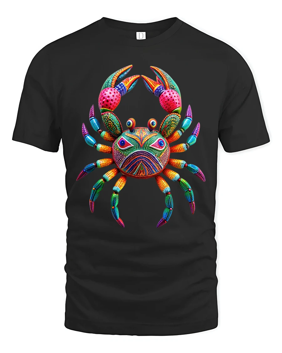 The colorful crab graphic t shirt features a vibrant and highly detailed crab illustration bursting with bold colors and artistic patterns.