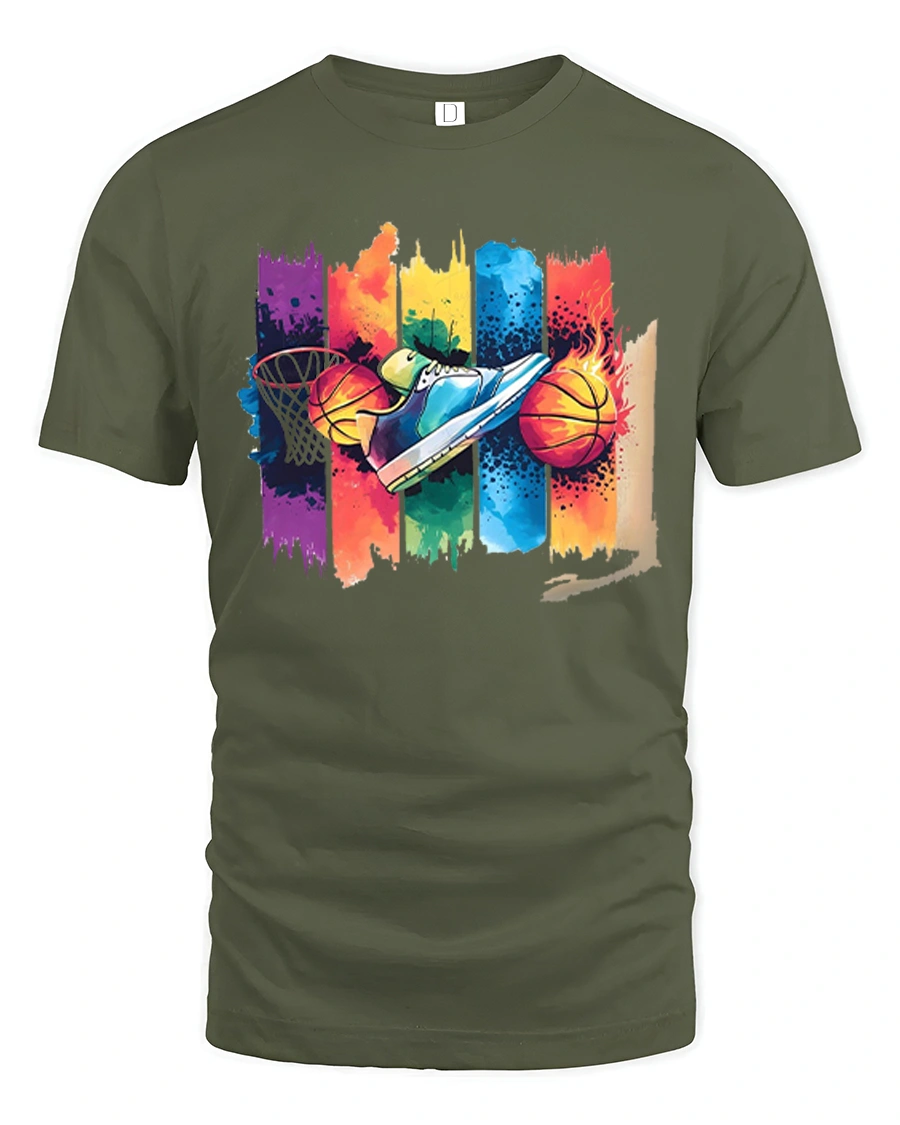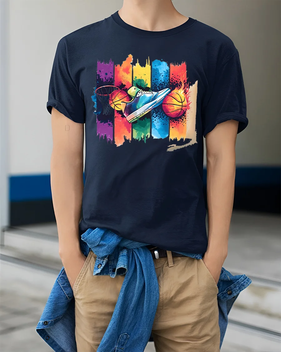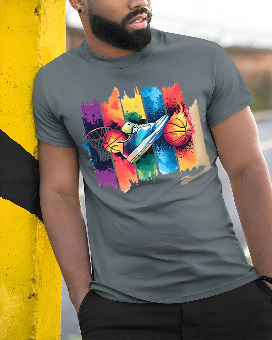 This Colorful Basketball Sneaker Graphic T-Shirt brings bold energy and street-style attitude to your wardrobe with its vibrant design. Featuring a dynamic sneaker and basketball artwork against multicolored paint-style stripes, this tee captures the excitement and creativity of the game. Its eye-catching details and bright tones make it the perfect pick for athletes and fans who want a standout look.