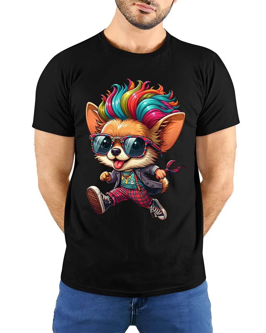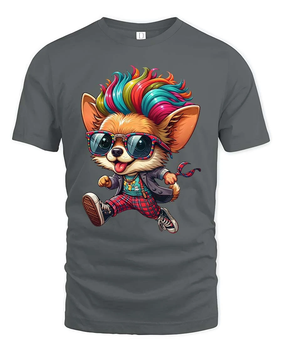 Featuring a playful dog character with bright rainbow hair and trendy streetwear style, this graphic tee instantly adds personality to your outfit.