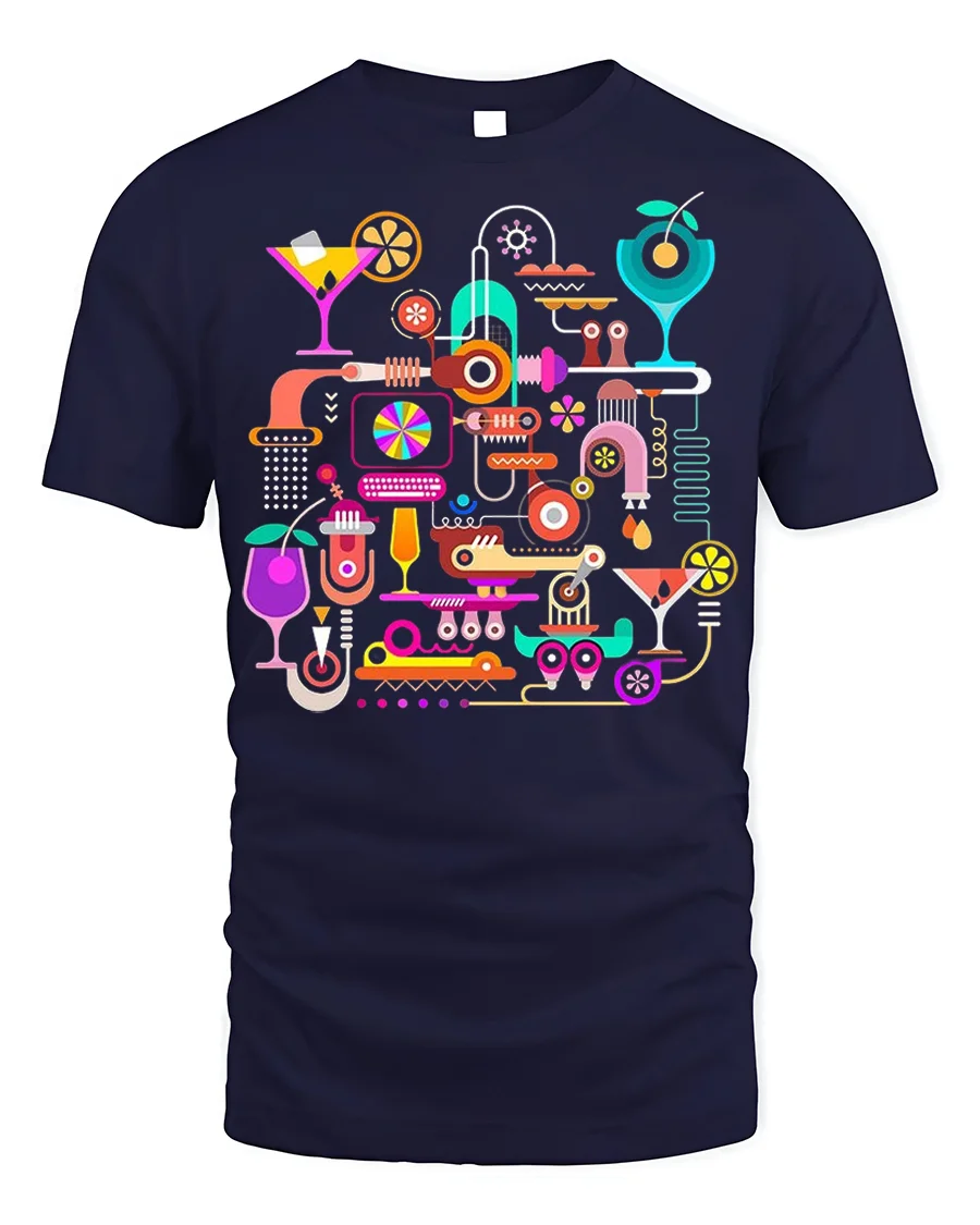 Printed proudly in the USA, the Colorful Cocktail Machine Art T-shirt for Men is where fun meets fashion—cheers to that!