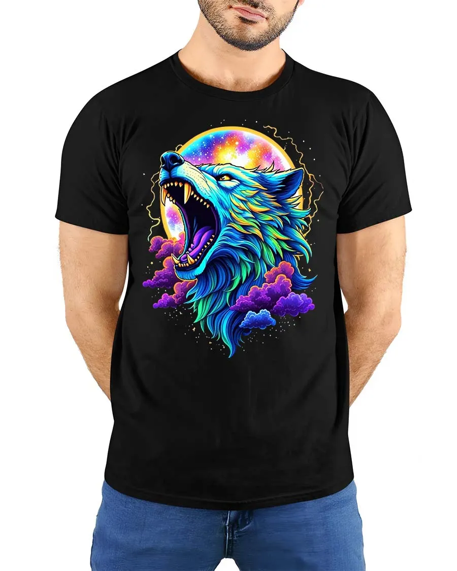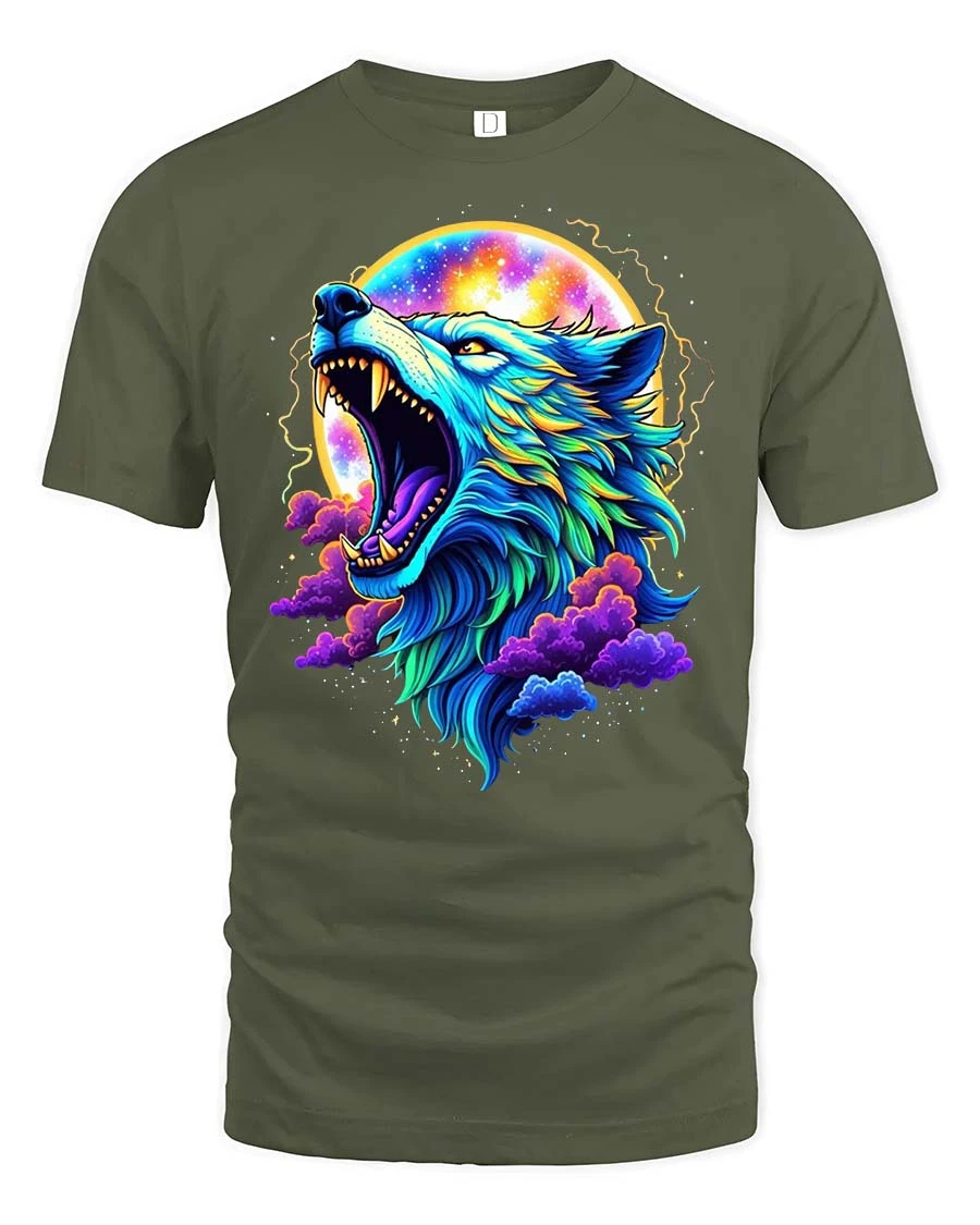 Colorful Cosmic Wolf Howling Galaxy Fantasy Art Tshirt features a powerful wolf illustration surrounded by vibrant cosmic colors and glowing celestial atmosphere.