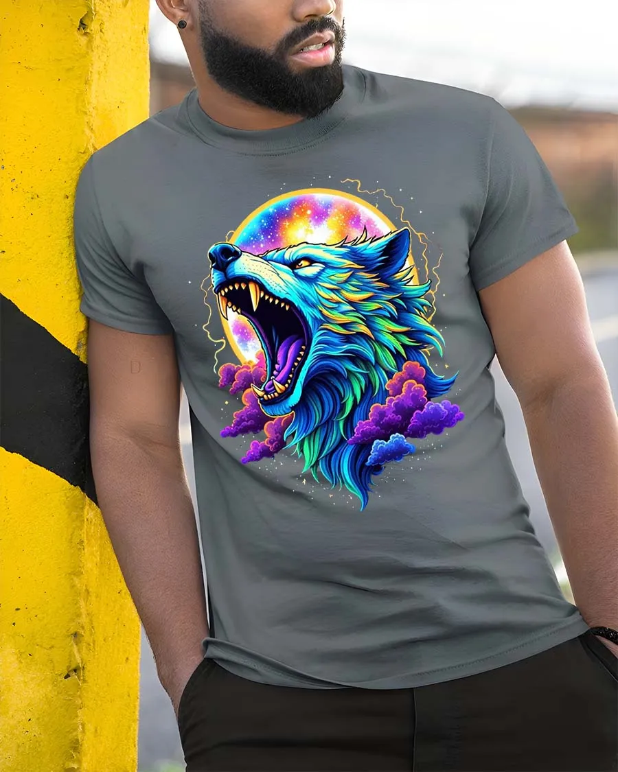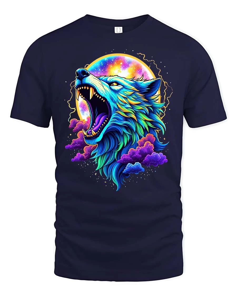 Colorful Cosmic Wolf Howling Galaxy Fantasy Art Tshirt pairs easily with modern casual wardrobe choices and creative lifestyle expression.