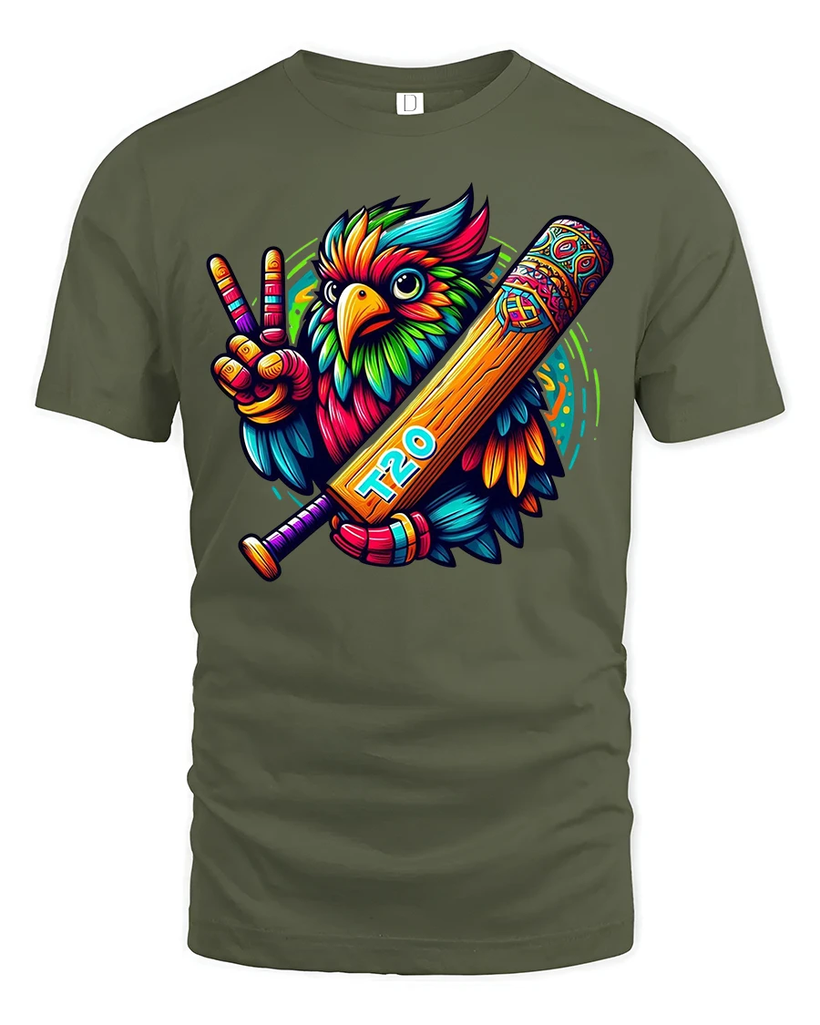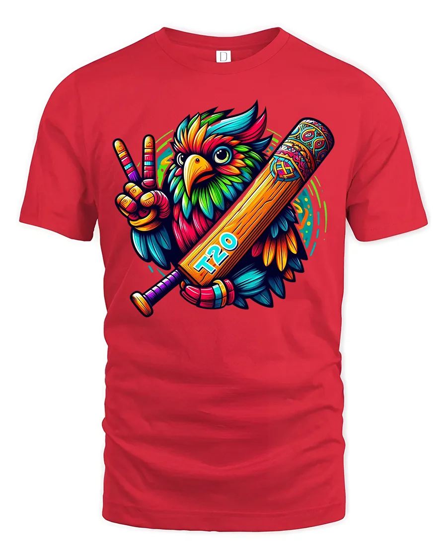 Featuring a vibrant bird holding a cricket bat marked “T20,” this design bursts with energy, color, and fun.