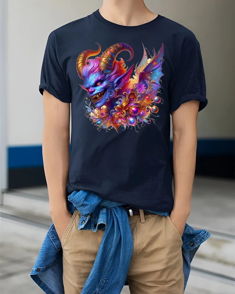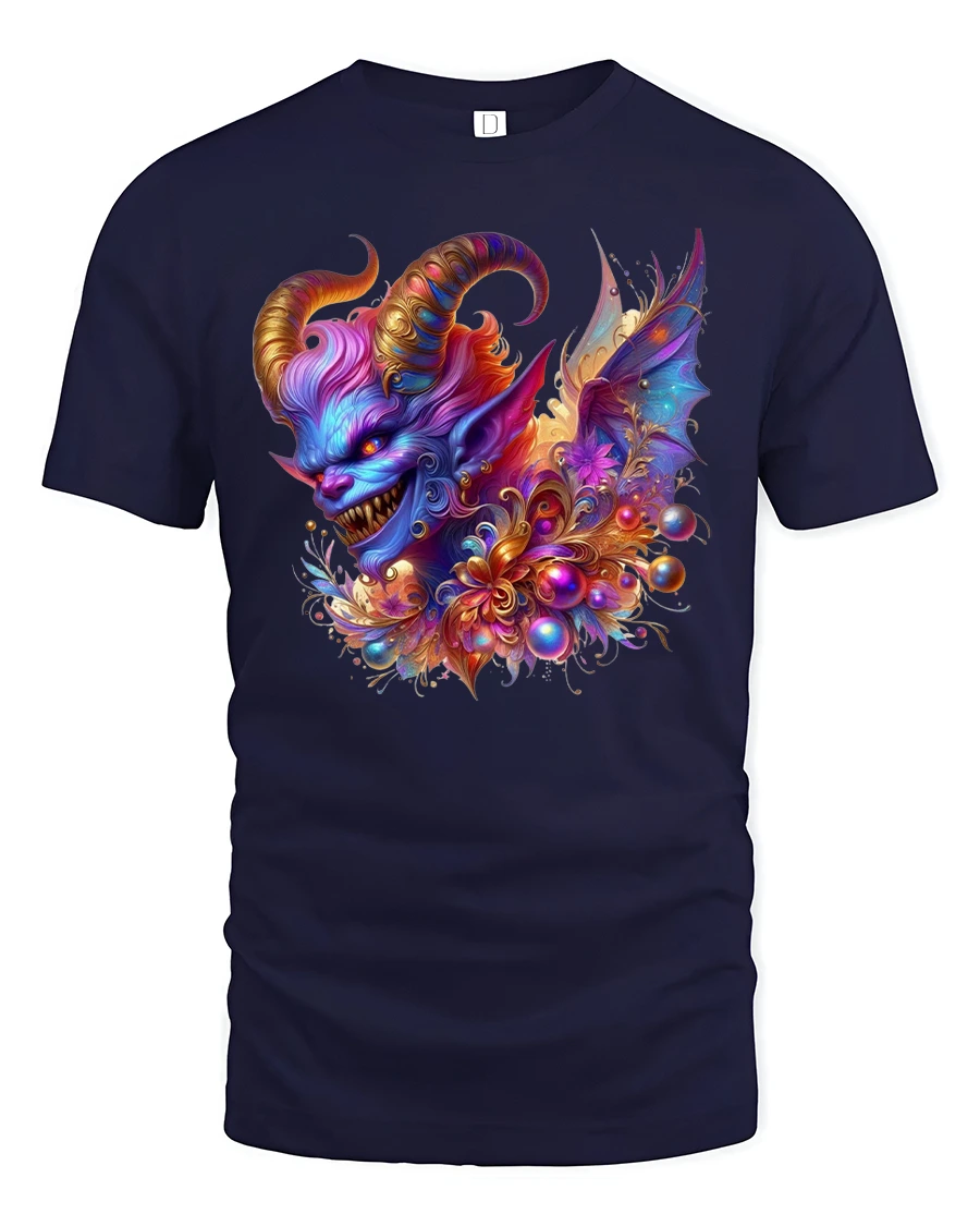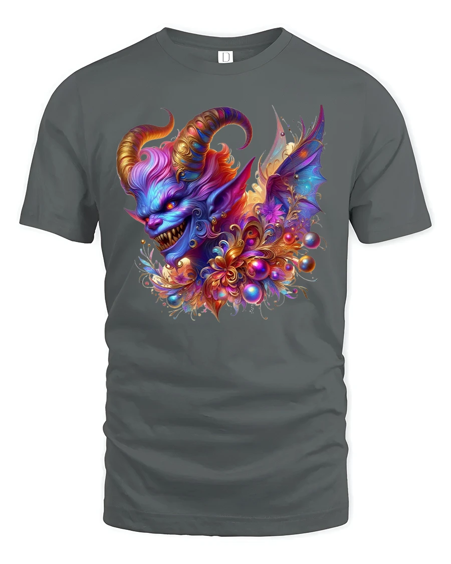 Featuring a striking, multi-colored demon with glowing horns and a mischievous grin, this tee blends dark fantasy with vivid artistic flair.