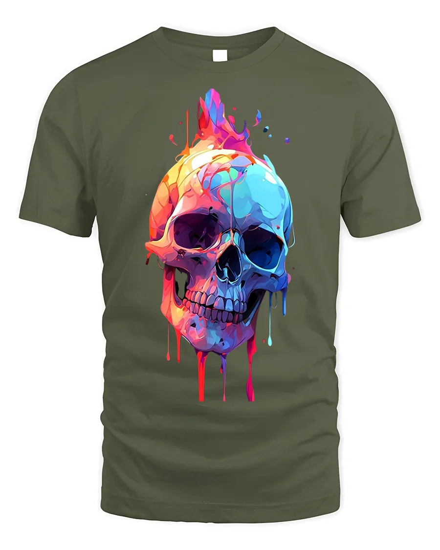 Colorful Dripping Skull T-Shirt - Psychedelic Skull Tee - military green t-shirt on white background