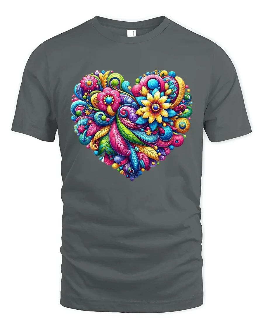 The Colorful Floral Heart Art Graphic Tee With Vibrant Joyful Energy reflects love positivity and expressive art.
