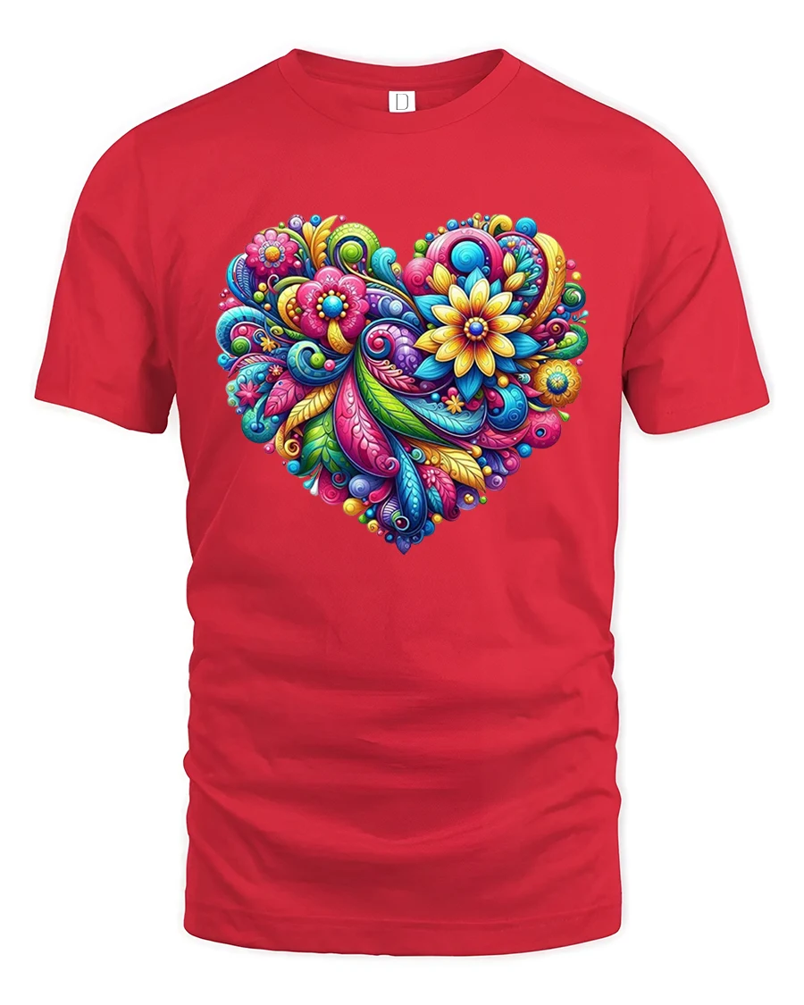 Colorful Floral Heart Art Graphic Tee With Vibrant Joyful Energy - red t-shirt on white background