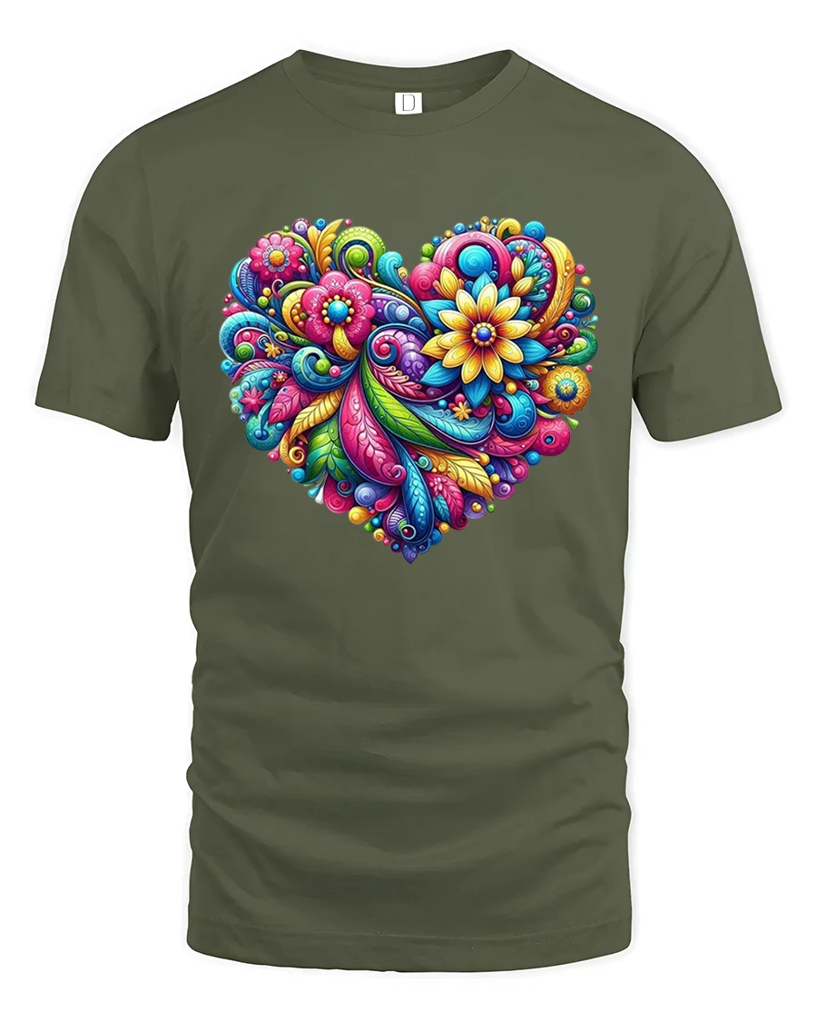 Colorful Floral Heart Art Graphic Tee With Vibrant Joyful Energy - military green t-shirt on white background