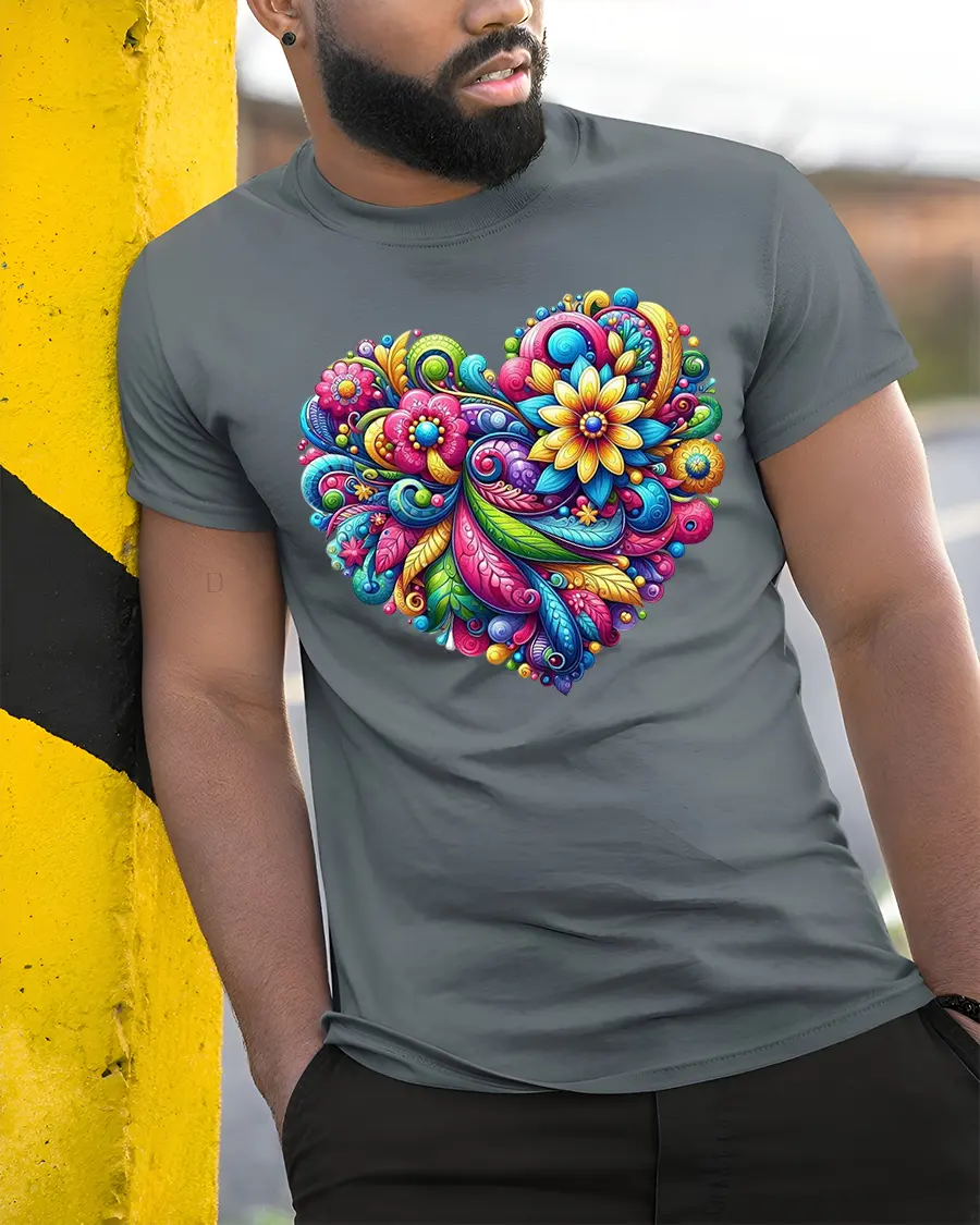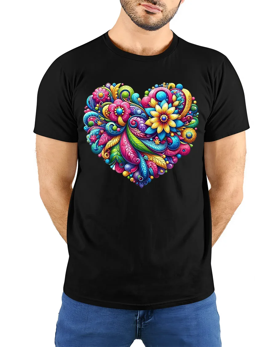 The Colorful Floral Heart Art Graphic Tee With Vibrant Joyful Energy reflects love positivity and expressive art.