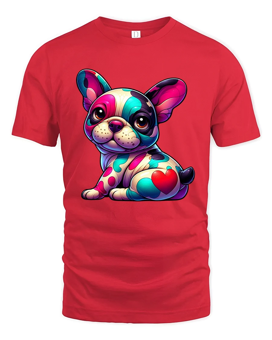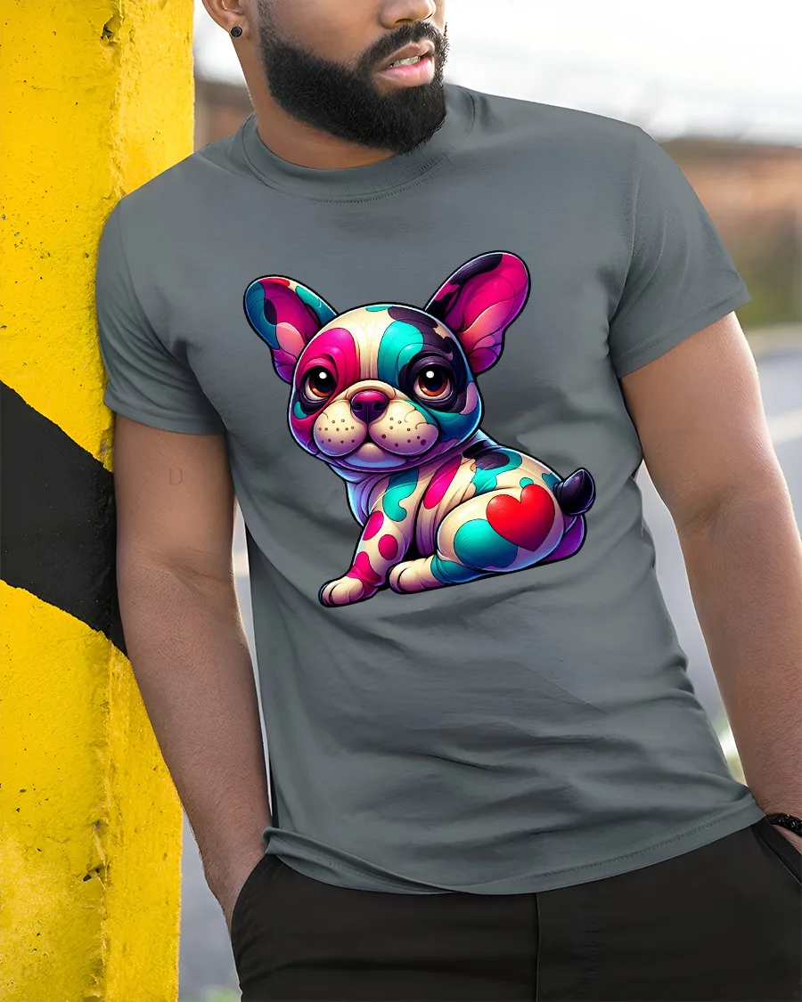 Brighten your wardrobe with the Colorful French Bulldog Pop Art T Shirt. This eye catching design features an adorable frenchie covered in vibrant artistic patterns with a bold heart detail that adds extra charm. The french bulldog t shirt combines playful cartoon style with modern pop art flair, creating a fun and expressive look that instantly stands out.