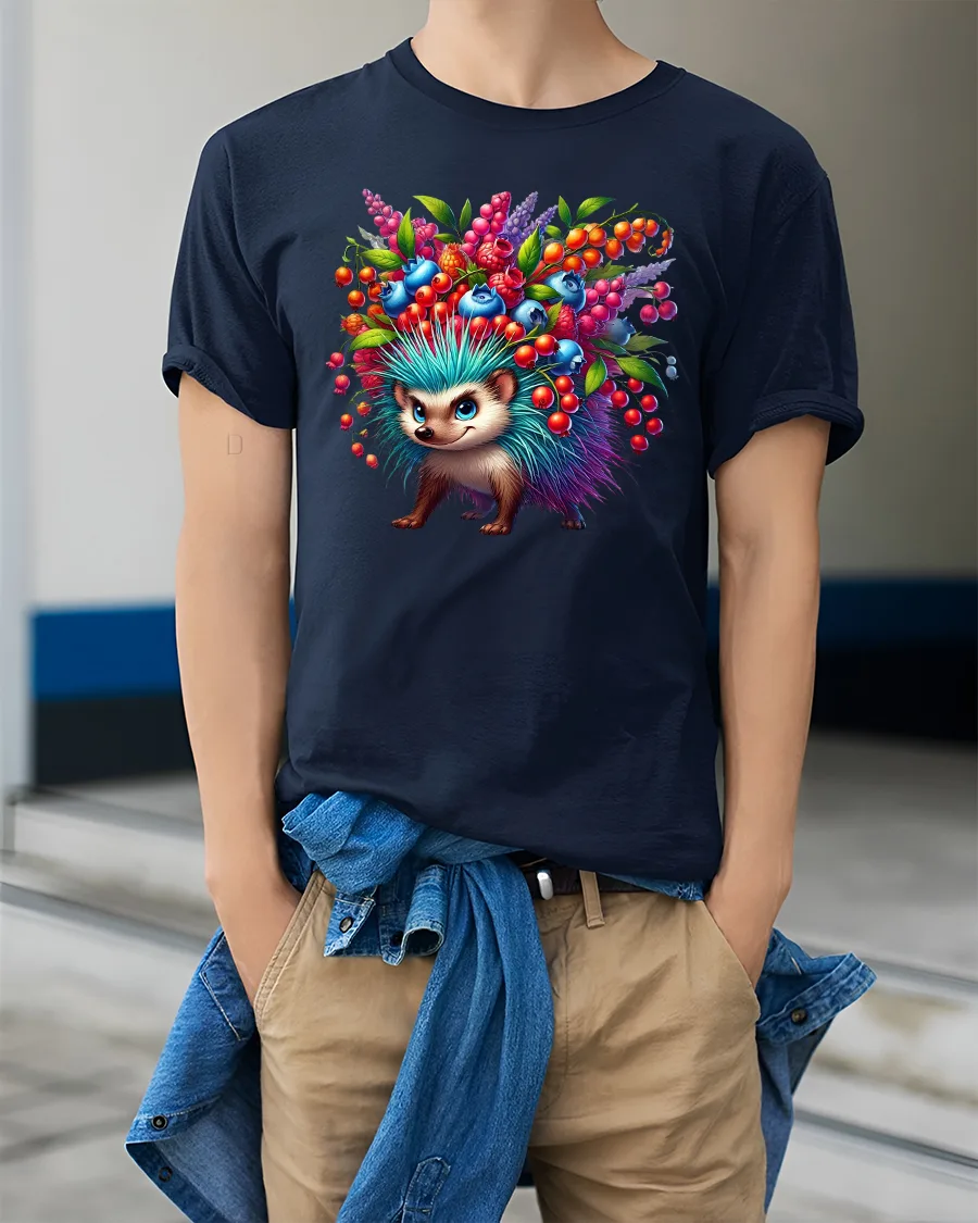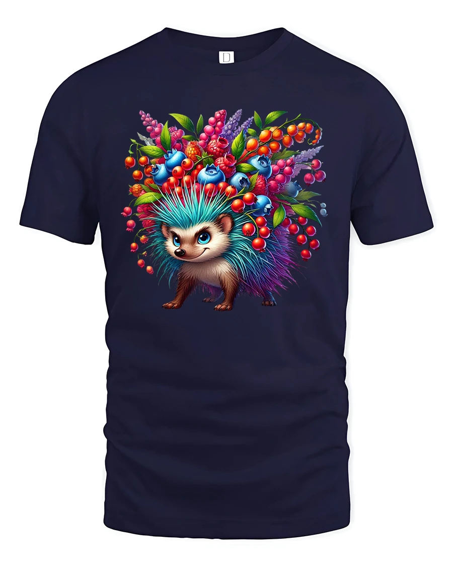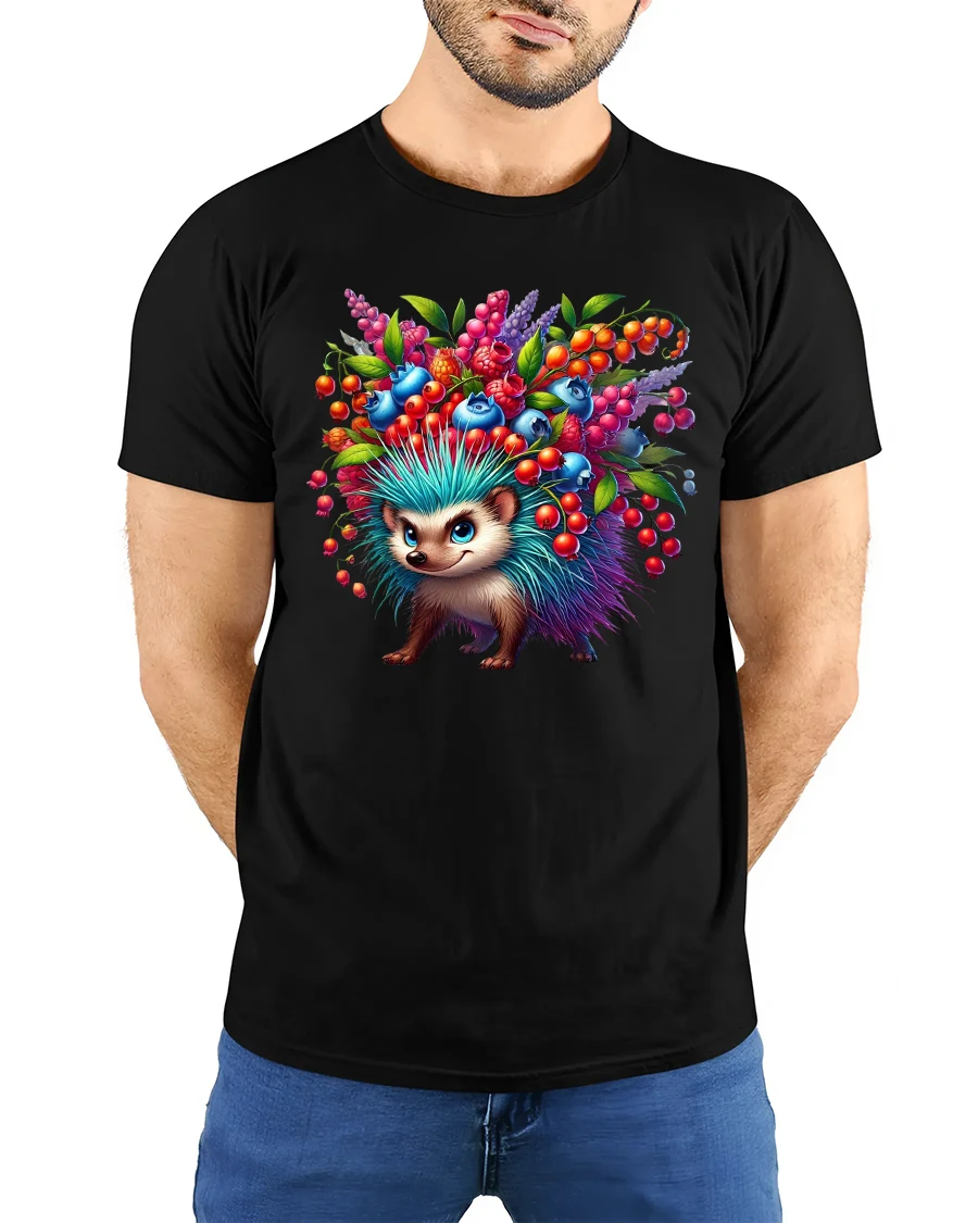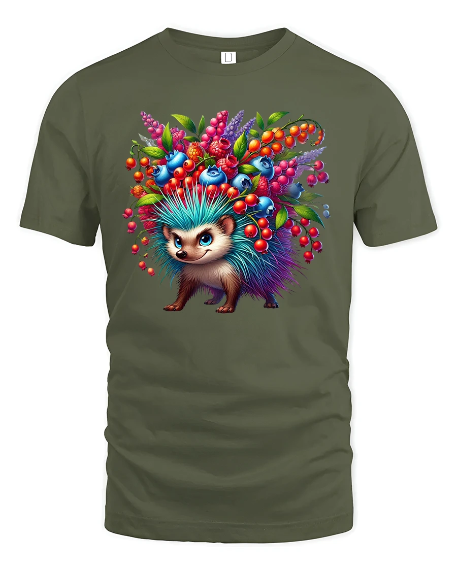 Bring a splash of joy to your outfit with this Colorful Hedgehog with Berries Cute Animal Graphic Tee, featuring a cheerful hedgehog surrounded by bright berries and flowers.