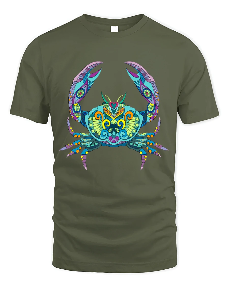 Colorful Mandala Crab Graphic Tee features a striking crab illustration inspired by intricate mandala patterns and vibrant ocean tones.