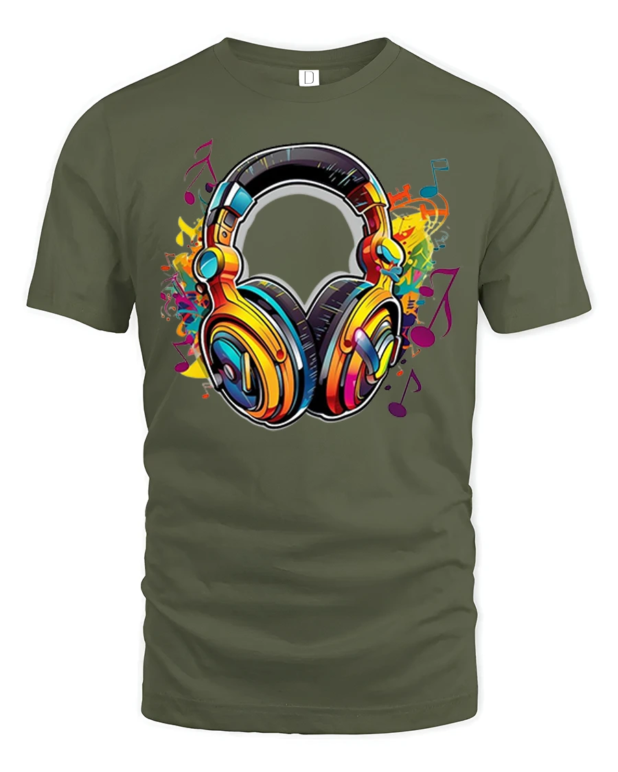 Colorful Music Headphones Art Tee Vibrant Sound Graphic T Shirt - military green t-shirt on white background