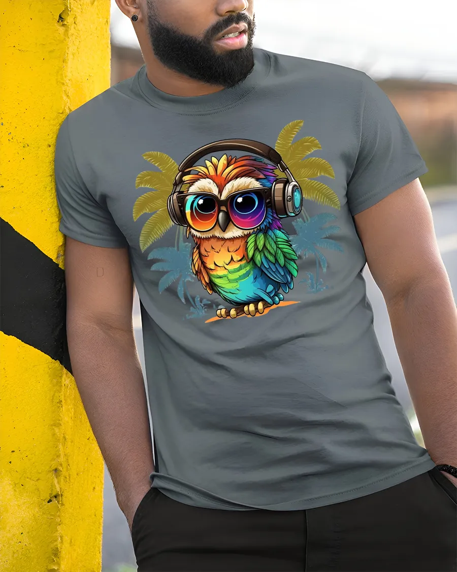 With its retro colors, tropical flair, and adorable character, the Colorful Owl Headphones Tee Retro Tropical Vibe TShirt works for music lovers, animal fans, and anyone who likes wearing art that sparks smiles. Add a touch of personality and color to your outfit with this lively printed tee.